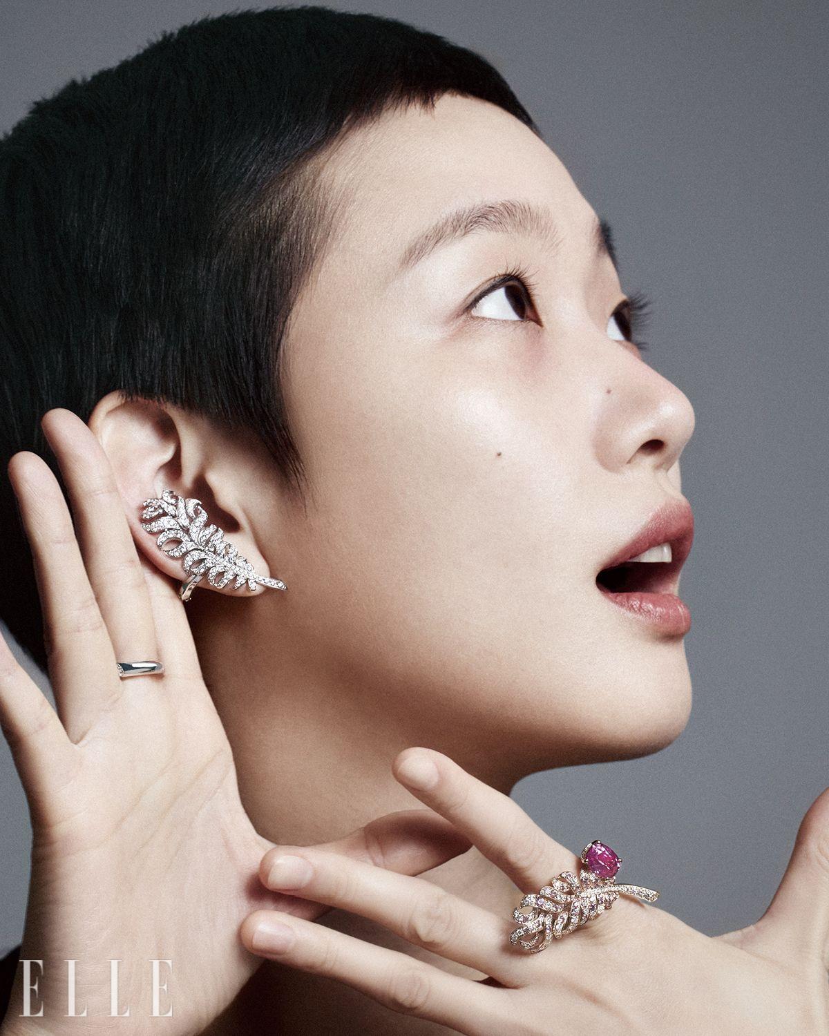 18K 화이트골드에 다이아몬드를 세팅한 플륌 드 샤넬 2024 하이 주얼리 컬렉션 이어링과 18K 핑크골드, 핑크 사파이어, 다이아몬드로 이뤄진 플륌 드 샤넬 2024 하이 주얼리 컬렉션 링은 모두 Chanel High Jewelry.