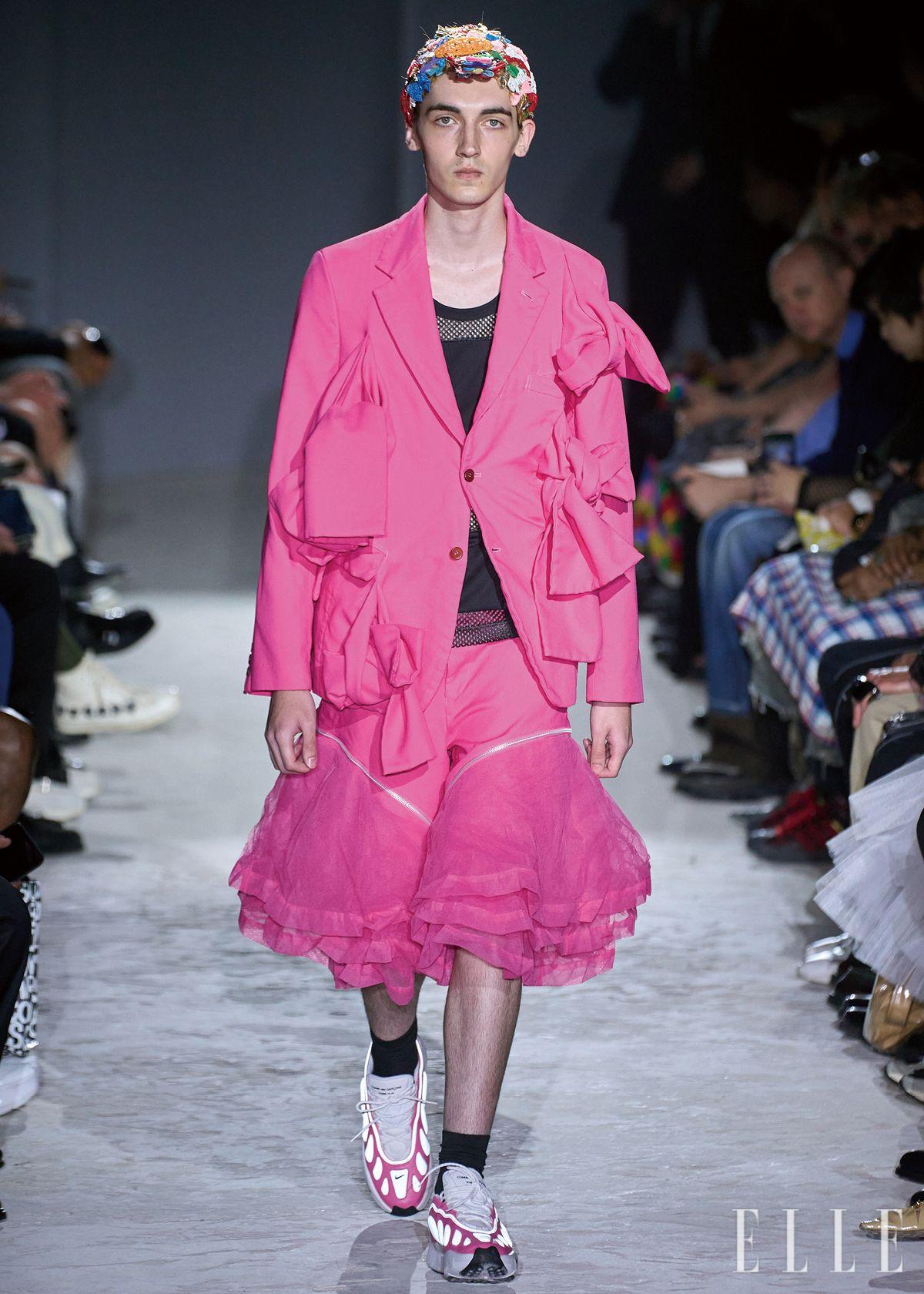 핑크 리본 디테일 재킷에 플레어 쇼츠를 매치해 사랑스러운 Comme Des Garcons Homme Plus.