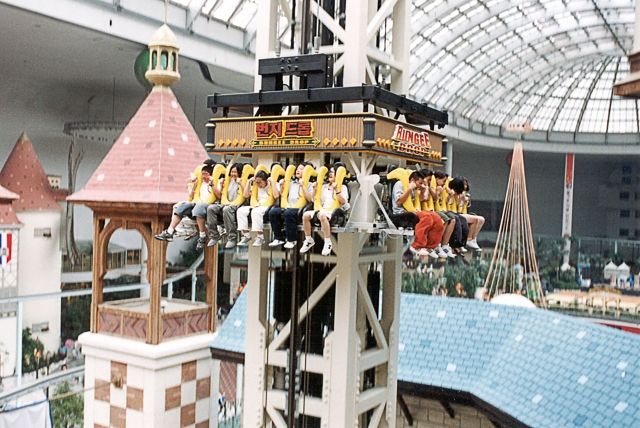 번지드롭은 2000년대 초반 자이로드롭과 쌍벽을 이루는 어트랙션으로 사랑받았습니다. 탑승물이 최고 시속 72km로 32m 높이를 3회 왔다갔다 하는 식으로 운행했죠. 당초 실내에 설치됐던 번지드롭은 2006년부터 실외인 매직아일랜드로 옮겨 명성을 누렸어요. 누적 운행 횟수만 103만회가 넘고요, 왕복한 거리로 따지면 약 10만km입니다.