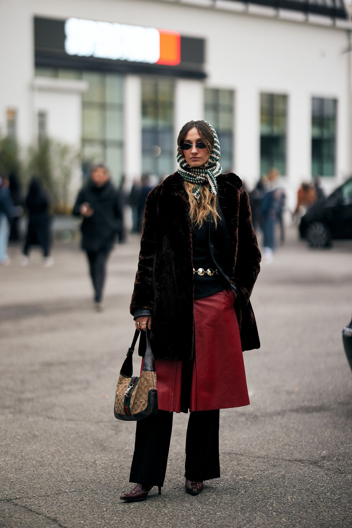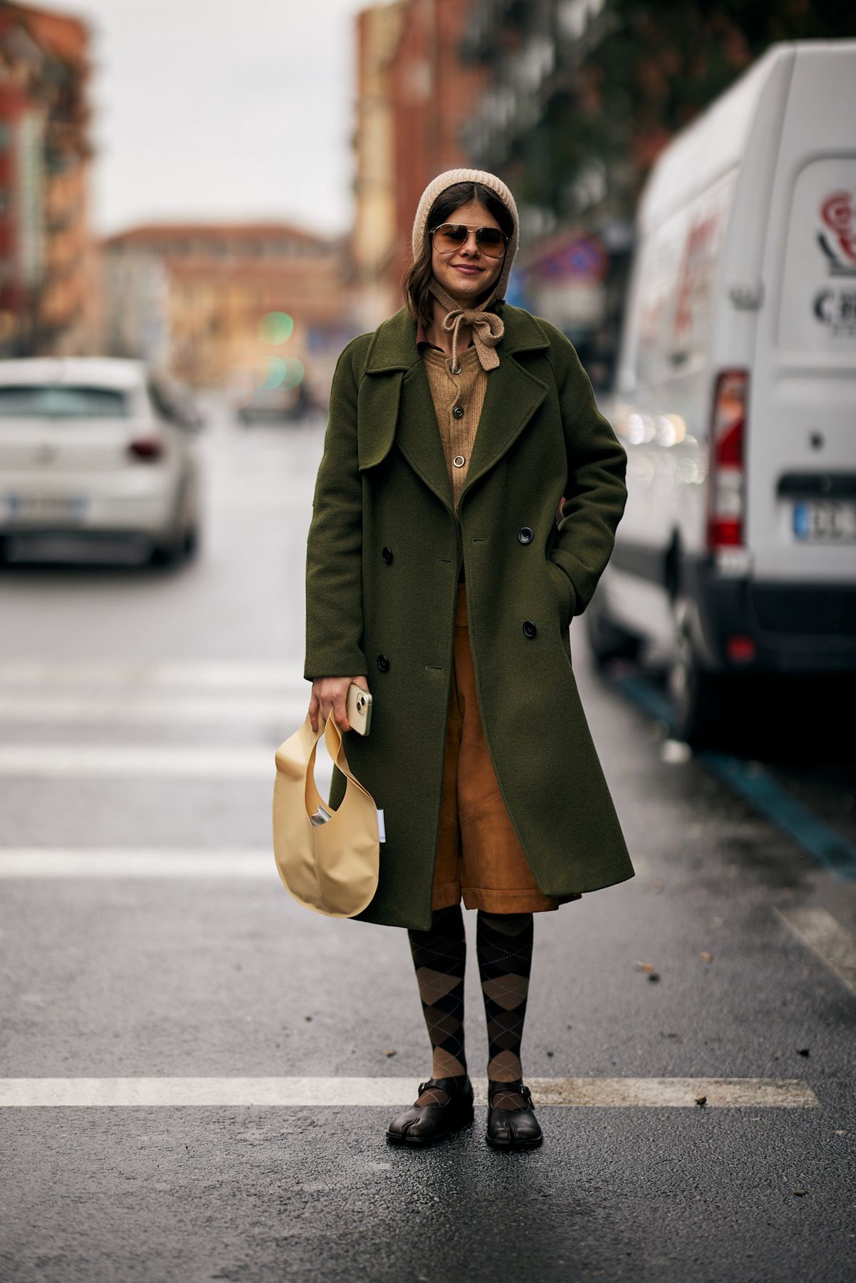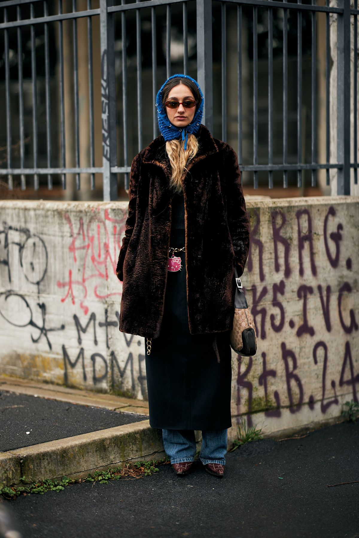 니트 보닛 스타일은 밀라노 길거리에서 가장 많이 포착된 아이템 중 하나입니다. 무심하게 머리와 목에 둘러매듯 연출하기도 좋고, 클래식한 소녀 감성을 끌어올리는 데도 필수죠.