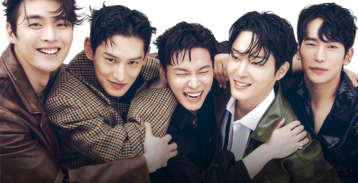 정수가 입은 레더 재킷은 Coach. 태환이 입은 브라운 코트와 이너 웨어 톱은 모두 스타일리스트 소장품. 태오가 입은 블랙 셔츠와 레더 팬츠는 모두 스타일리스트 소장품. 동호가 입은 카키 레더 재킷은 Ffeff Studio. 셔츠와 보타이는 모두 스타일리스트 소장품. 준서가 입은 재킷과 셔츠, 팬츠는 모두 McQueen by Seán McGirr.