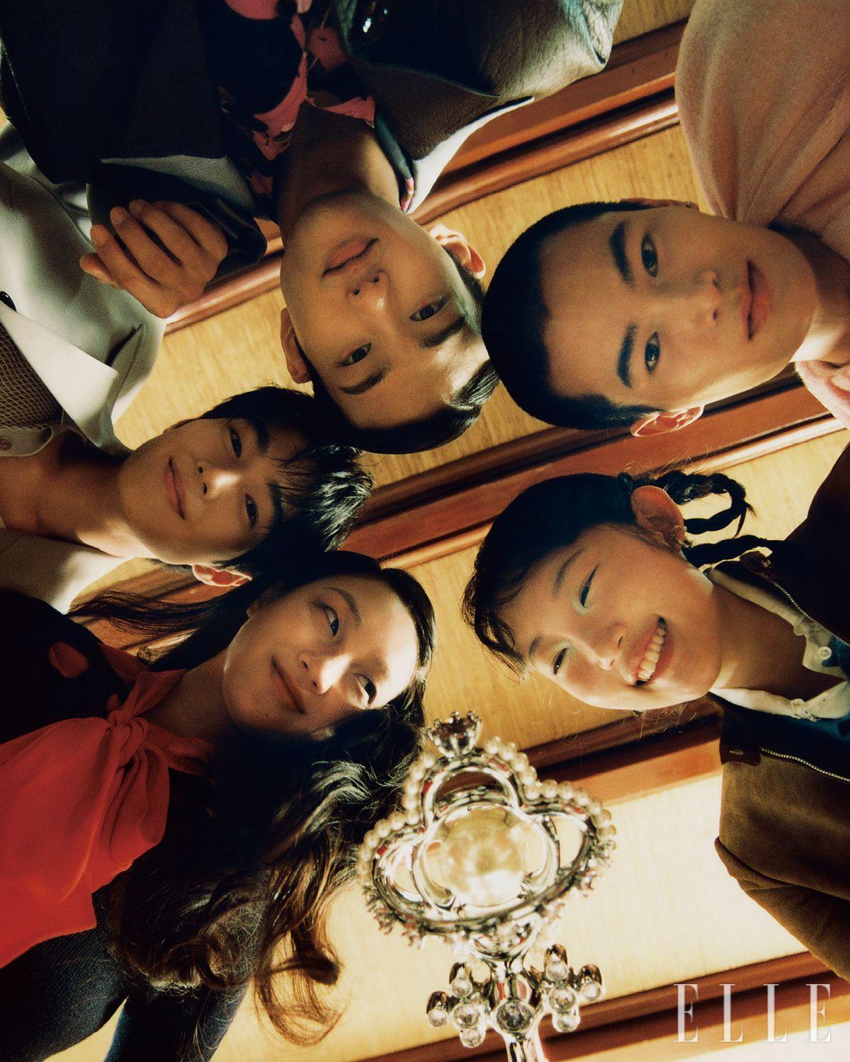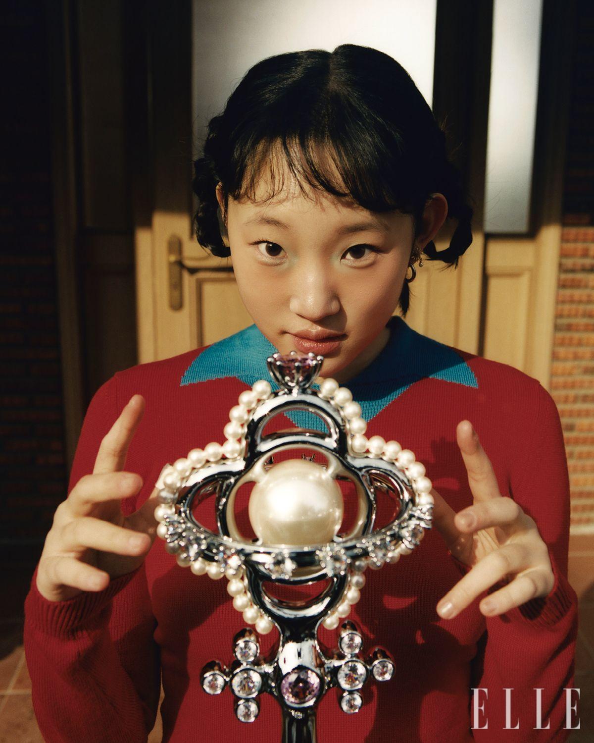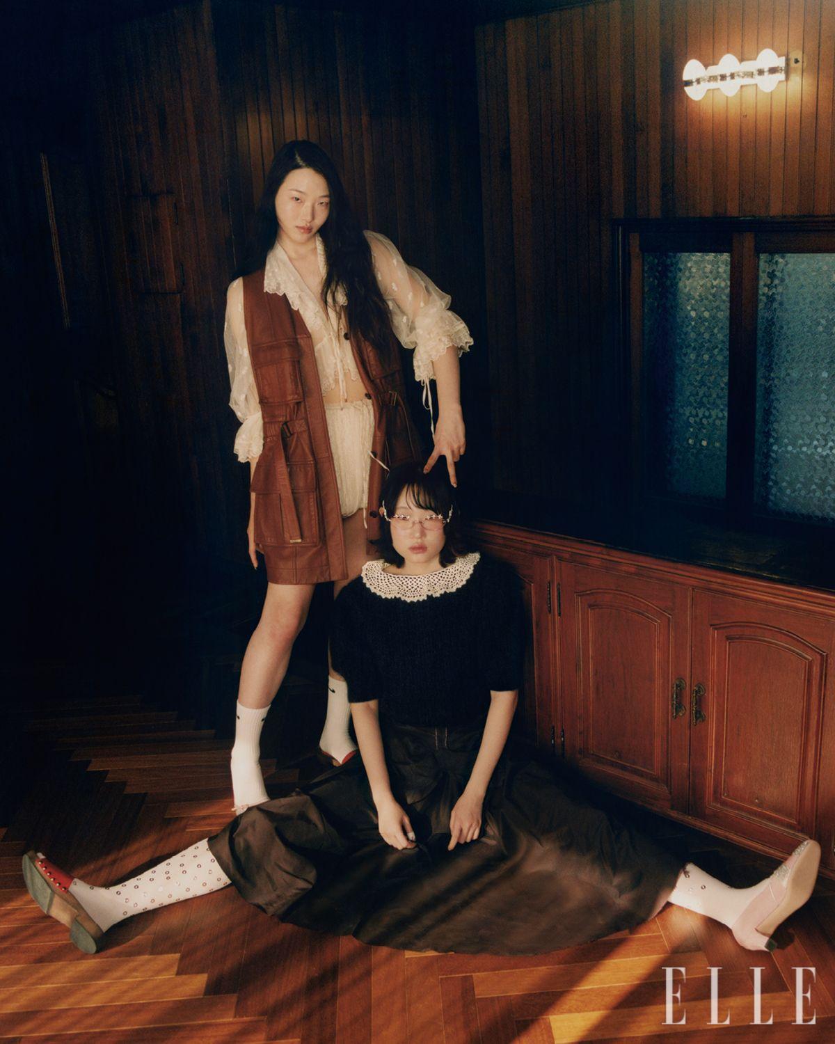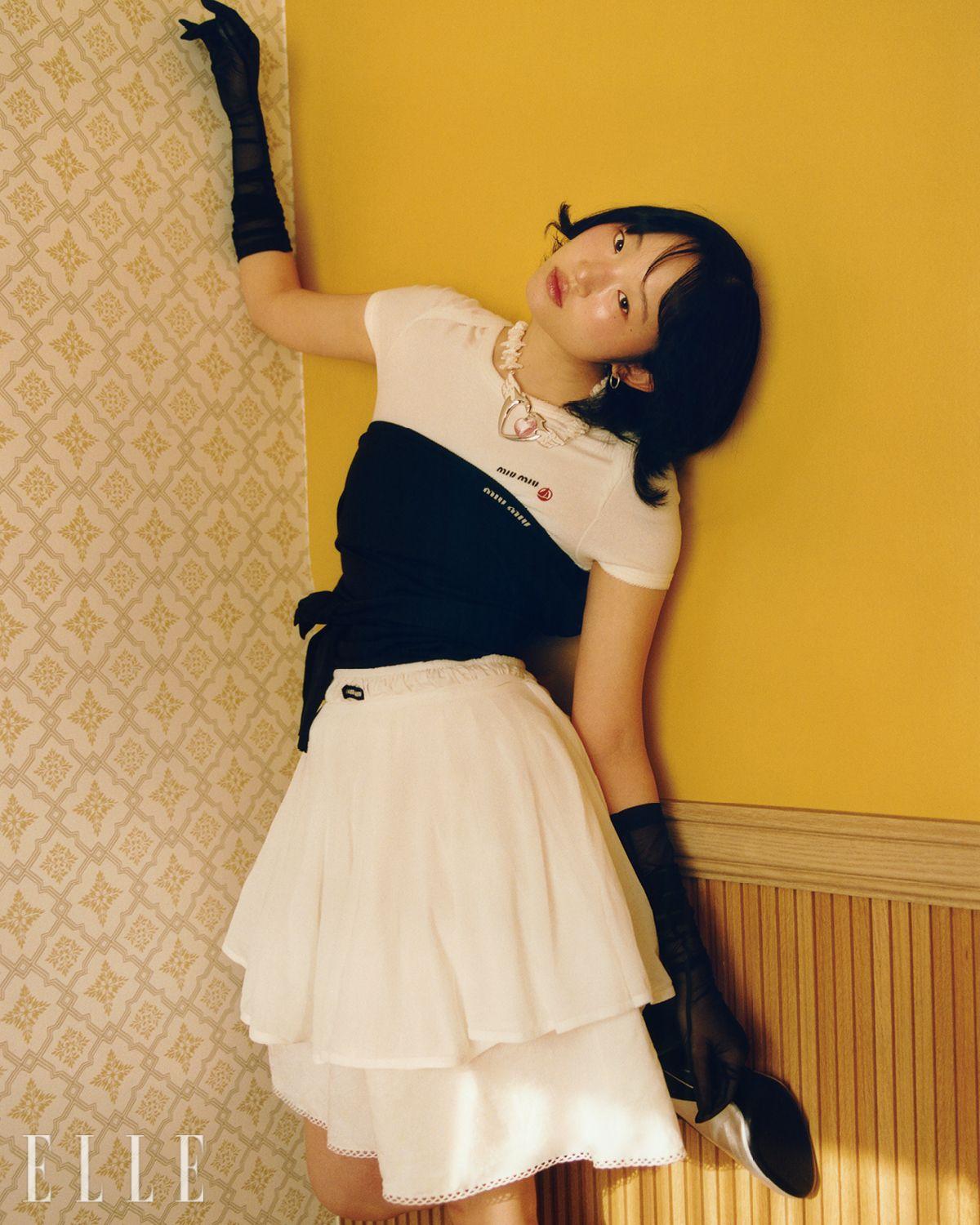 Miu Miu. 윤조가 입은 레드 셔츠와 절개 디테일의 니트 톱은 가격 미정, 모두