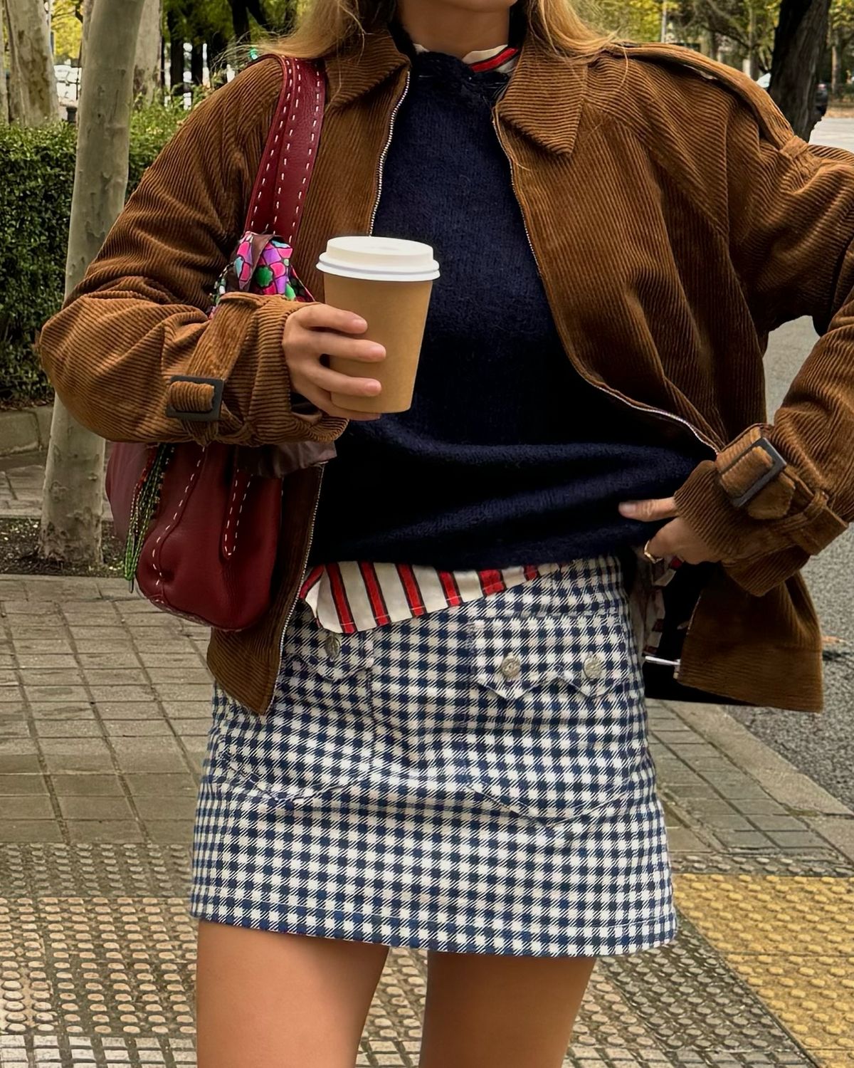 마드리드의 패션 인플루언서 앤디 워싱턴은 깅엄 체크 미니 스커트 위에 스웨이드 재킷을 매치해 빈티지한 무드를 살렸습니다. 이너로 스트라이프 패턴의 셔츠를 입어 스타일링 포인트를 더해줬네요.