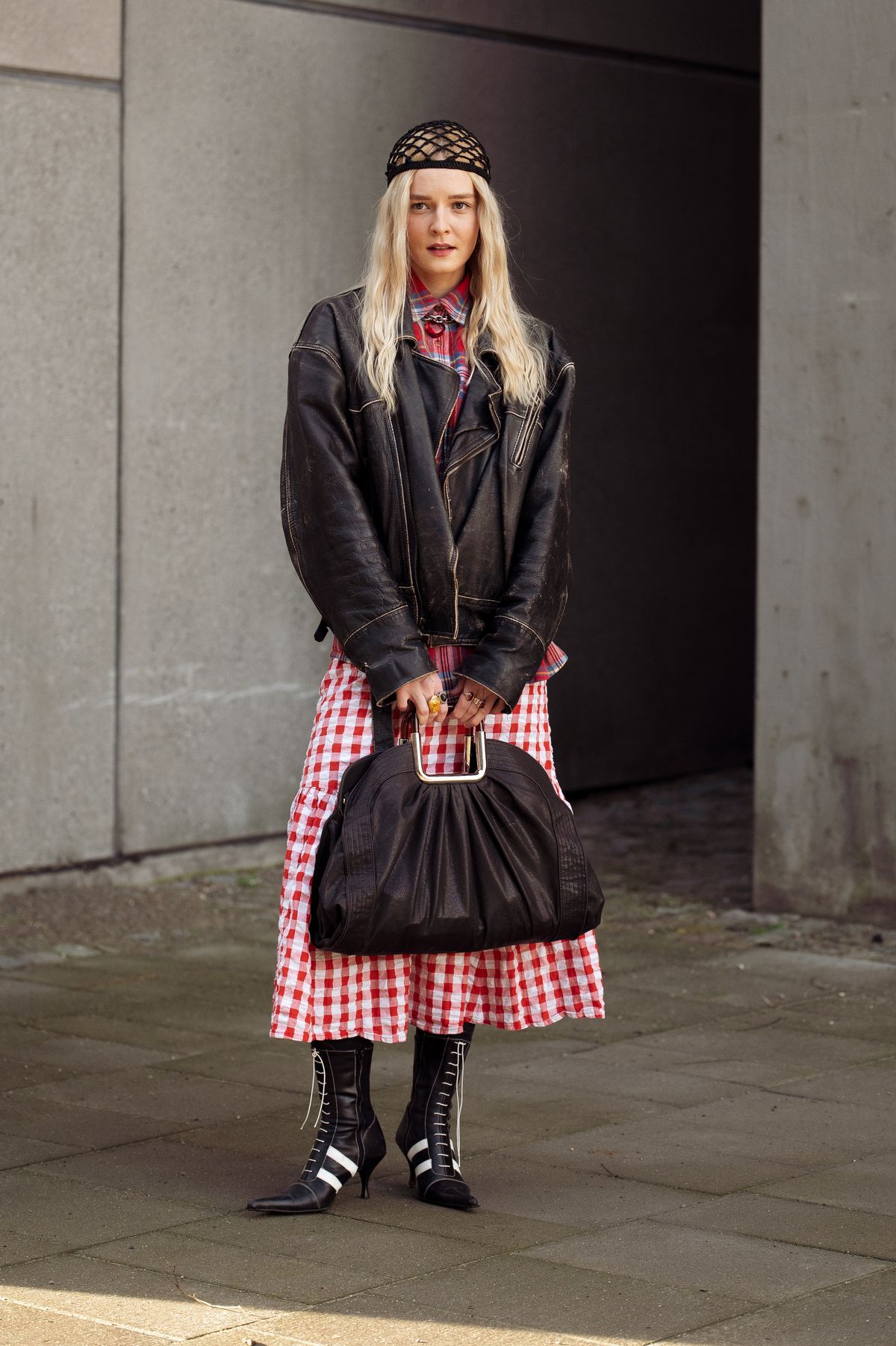 지난 달 열린 코펜하겐 패션 위크에서 가장 많이 포착된 패턴 역시 깅엄이었습니다. 레드 체크 스커트에 터프한 가죽 재킷을 매치하고 머리 위에는 네트 햇을 쓴 재기 발랄한 모습에 눈길이 가네요.