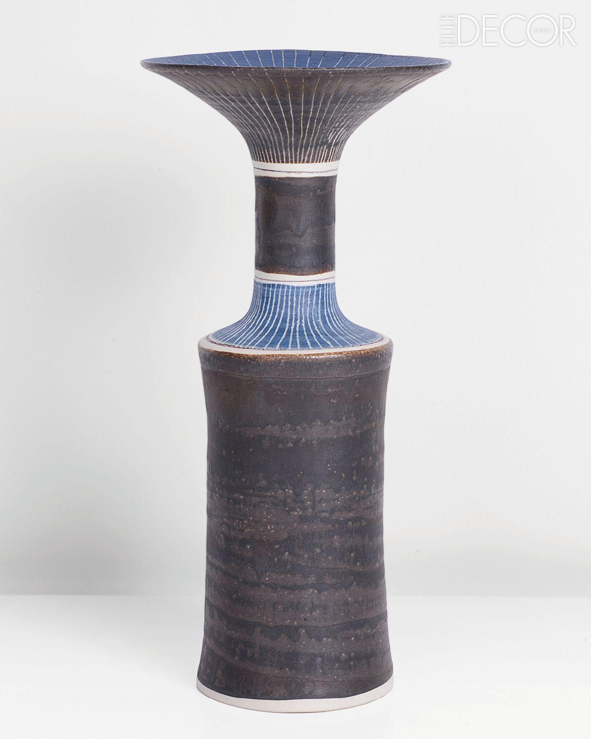 1982년에 제작된 27cm 높이의 스톤웨어 화병. 흰색 유약을 바르고 황금색 망간 테두리를 둘렀다. 프라이빗 컬렉션.
