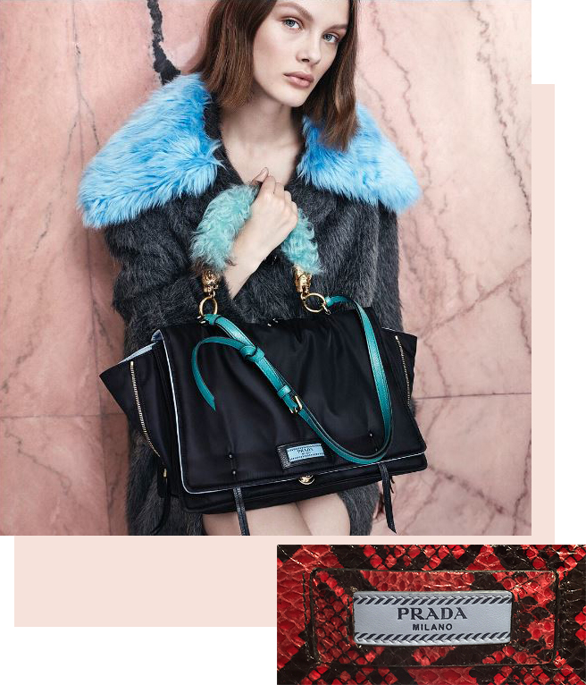 프라다는 2017 시즌의 프리폴 컬렉션에서 기존의 블루 라벨을 외부로 노출하는 에티켓 백을 선보였다. 의류와 액세서리들의 창의적인 교류 등을 강조하기 위한 이 탈격식적인 디자인은 로고와 라벨의 경계를 모호하게 만드는 새로운 도전이다. ‘프라다’라는 네임 밸류만으로도 이미 훌륭한 디자인이라는 자부심이 만들어낸 결과물이라고 해도 좋다.