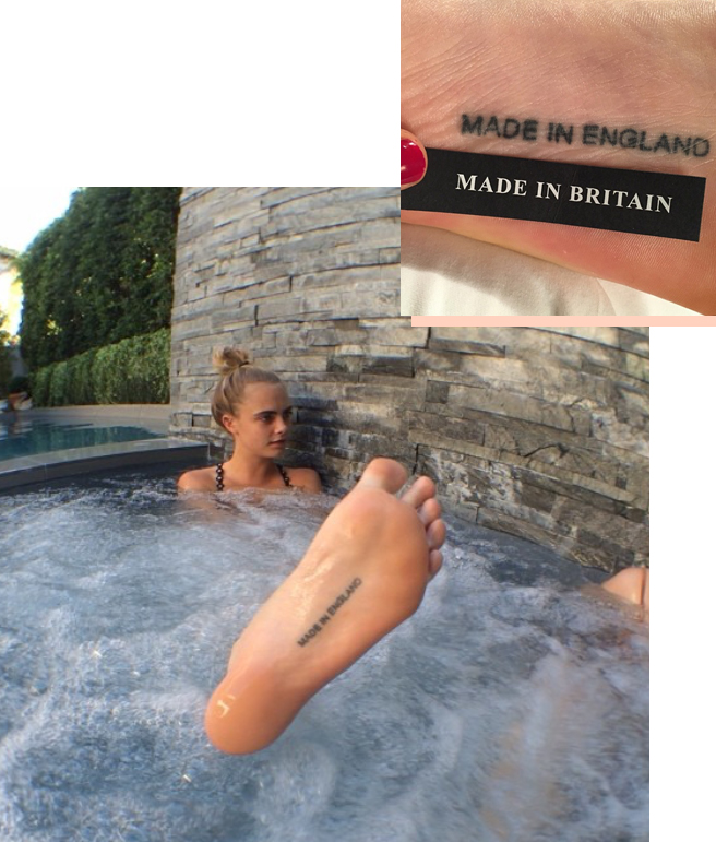 본인 스스로 레이블을 각인시킨 이들도 있다. 주인공은 바로 미우미우산 엘르 패닝과 영국산 카라 델레바인. 브랜드의 뮤즈로 컬렉션에 참석한 엘르 패닝의 귀여운 발상과 자신의 출생지를 발바닥에 각인시킨 카라 델레바인의 애국심이 낳은 새로운 레이블이다.
