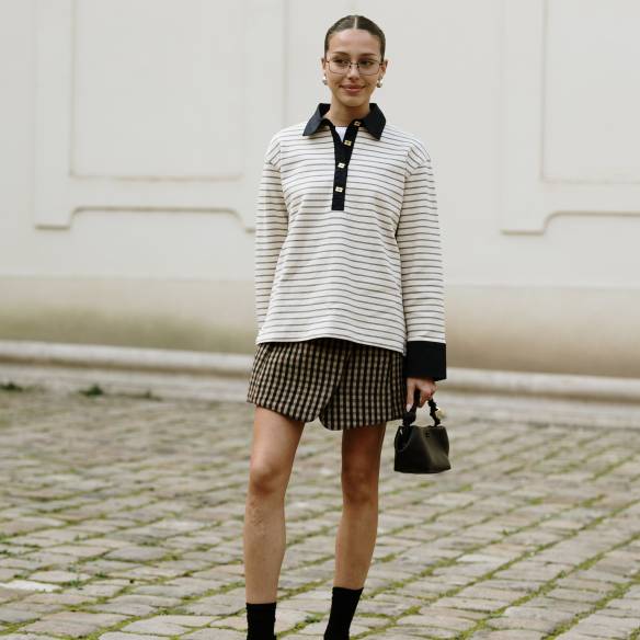 패션 인플루언서 포피 알몬드는 브라운 컬러의 반팔 니트 안에 줄무늬 티셔츠를 레이어링 했습니다. 누구나 하나쯤 갖고 있을 법한 아이템들이라 스타일링에 더 눈길이 가네요.