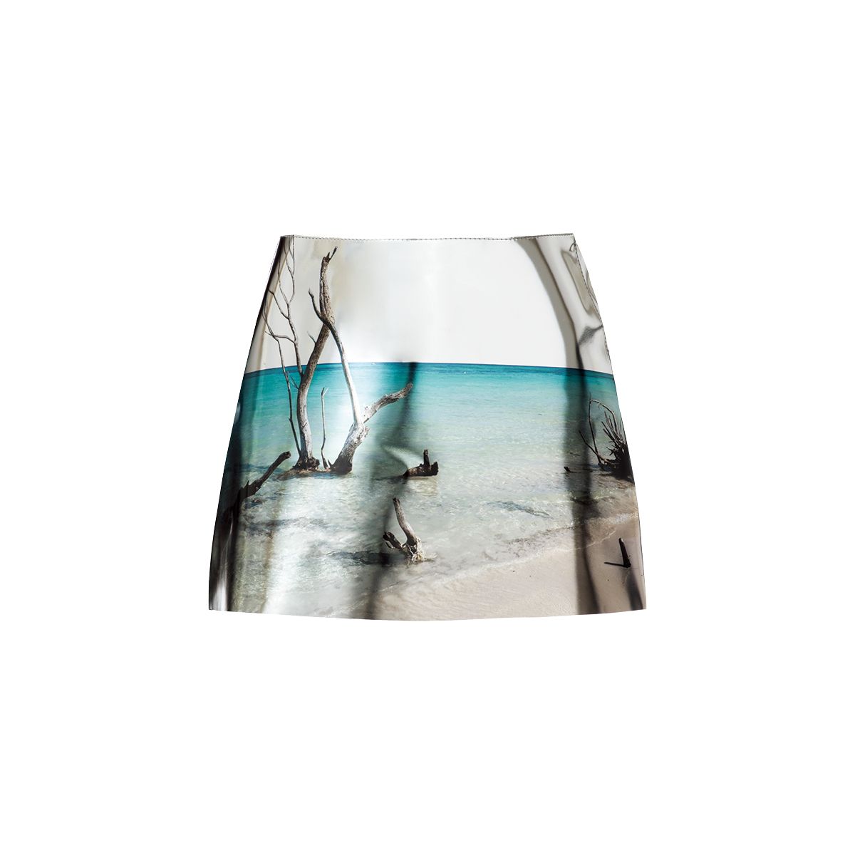 독특한 그림을 프린트한 메탈릭 스커트는 가격 미정, Prada.