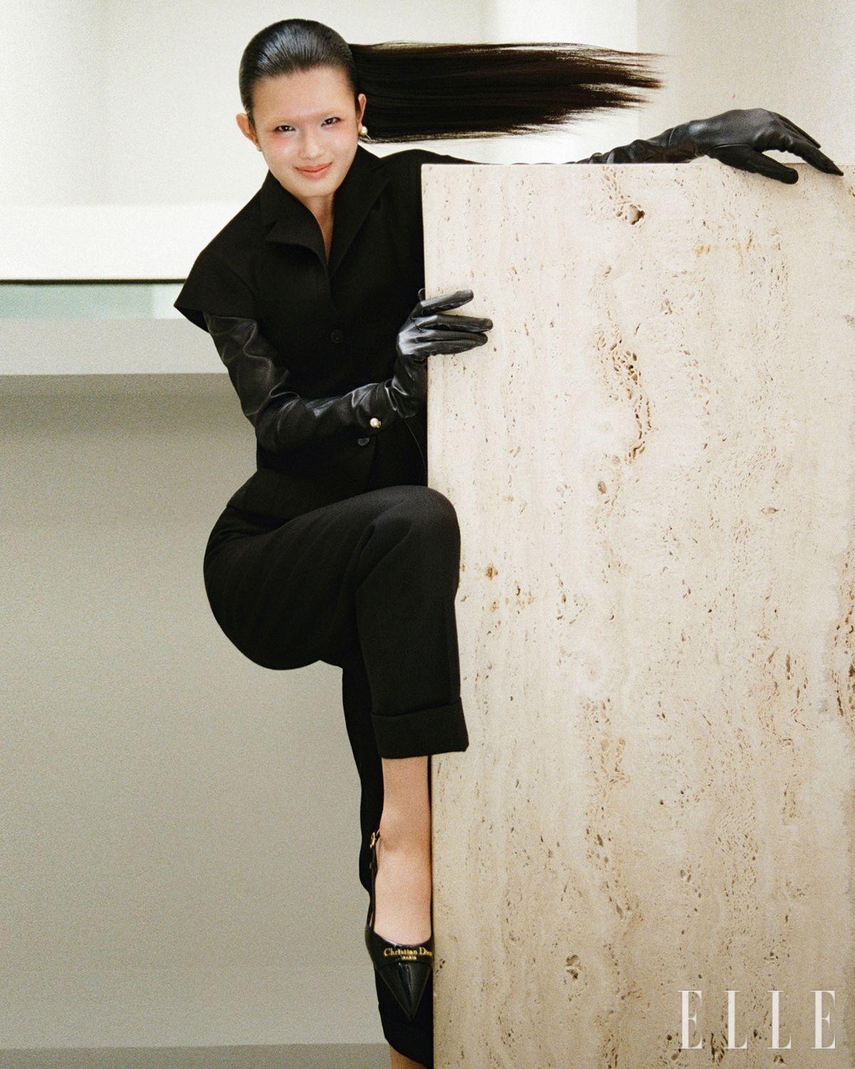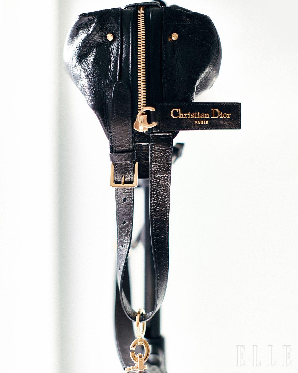 벨티드 재킷과 팬츠, 진주 이어링, 롱 레더 글러브, 로고 슬링백은 모두 Dior.