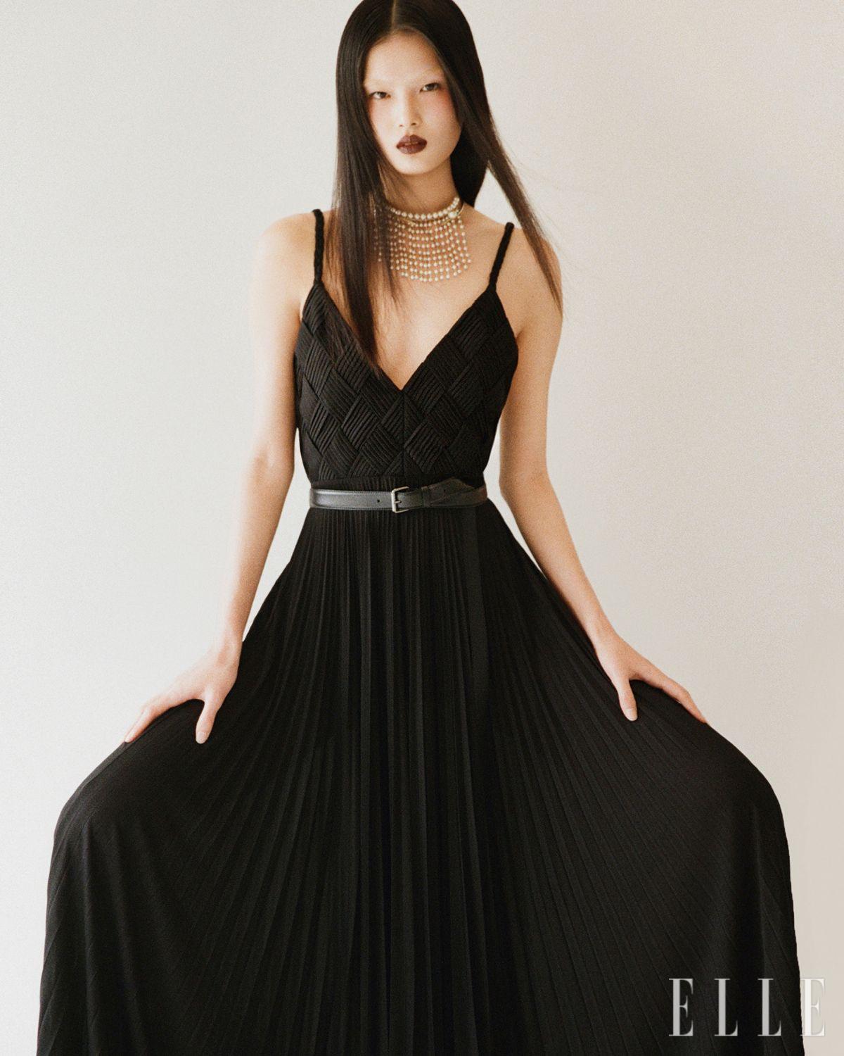 플리츠 롱 드레스와 벨트, 펄 드롭 초커, 레어어드한 화살 모티프의 네크리스는 모두 Dior.