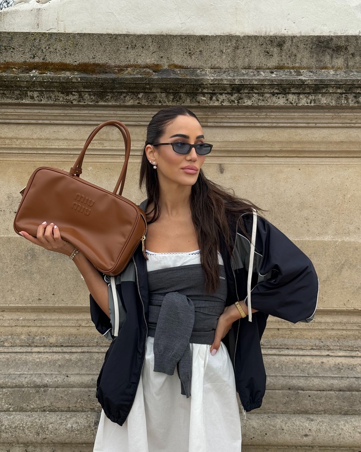한 편, 지금 SNS에서 가장 핫한 트랙 재킷 입는 법은 볼륨감 있는 원피스와 매치하는 것입니다. 인플루언서 타마라 칼리닉은 화이트 원피스 위에 카디건을 레이어링하고 미우 미우의 트랙 재킷을 어깨에 가볍게 걸쳤네요. 빅 백을 손에 움켜쥔 애티튜드까지 완벽하죠?