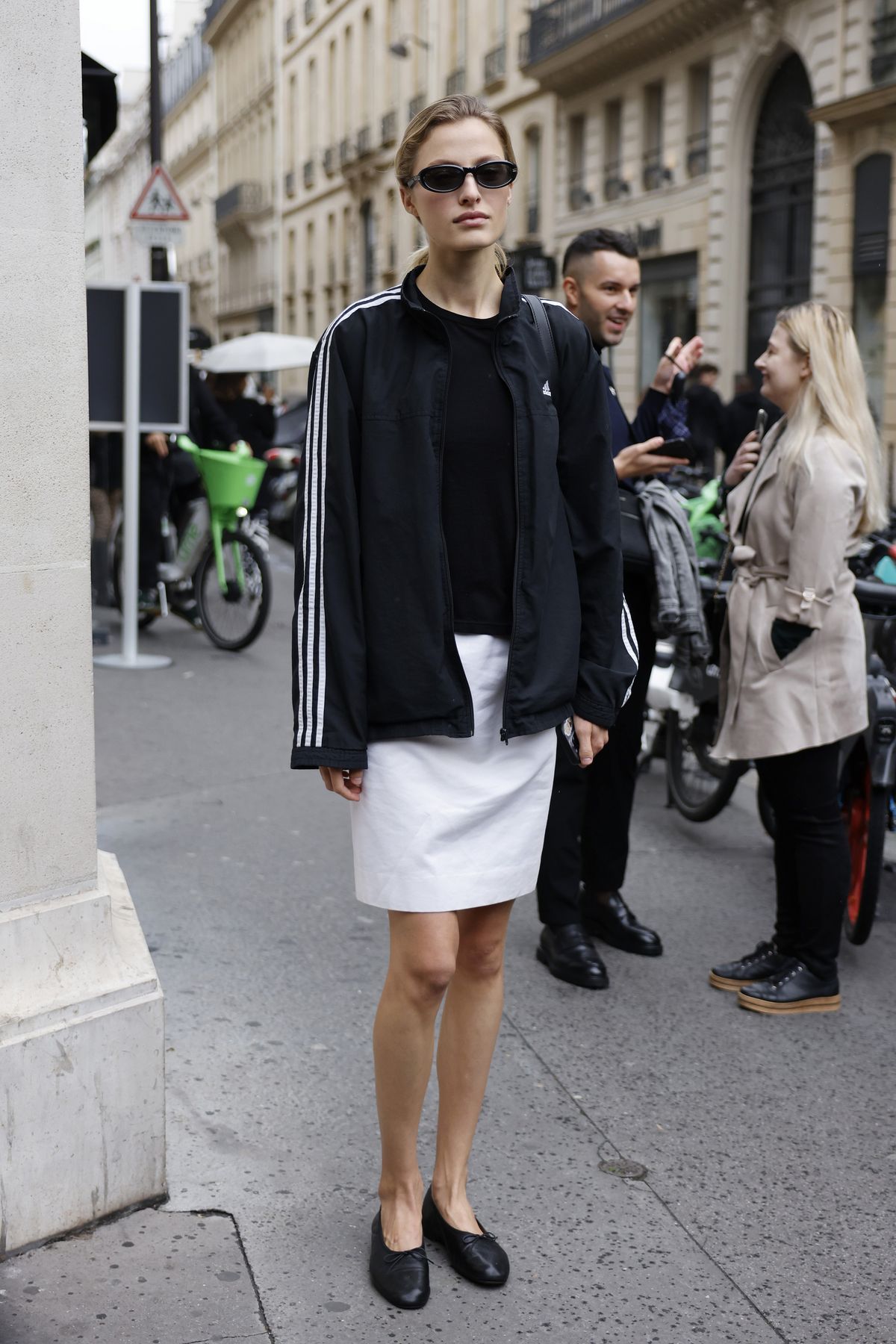 베이직한 아디다스의 블랙 트랙 재킷 아우터는 이렇게 단아한 버전으로도 소화할 수 있습니다. 일자로 떨어지는 미니멀한 라인의 화이트 치마를 입고 심플한 플랫 신발을 매치하기만 하면 끝이랍니다. 참 쉽죠?