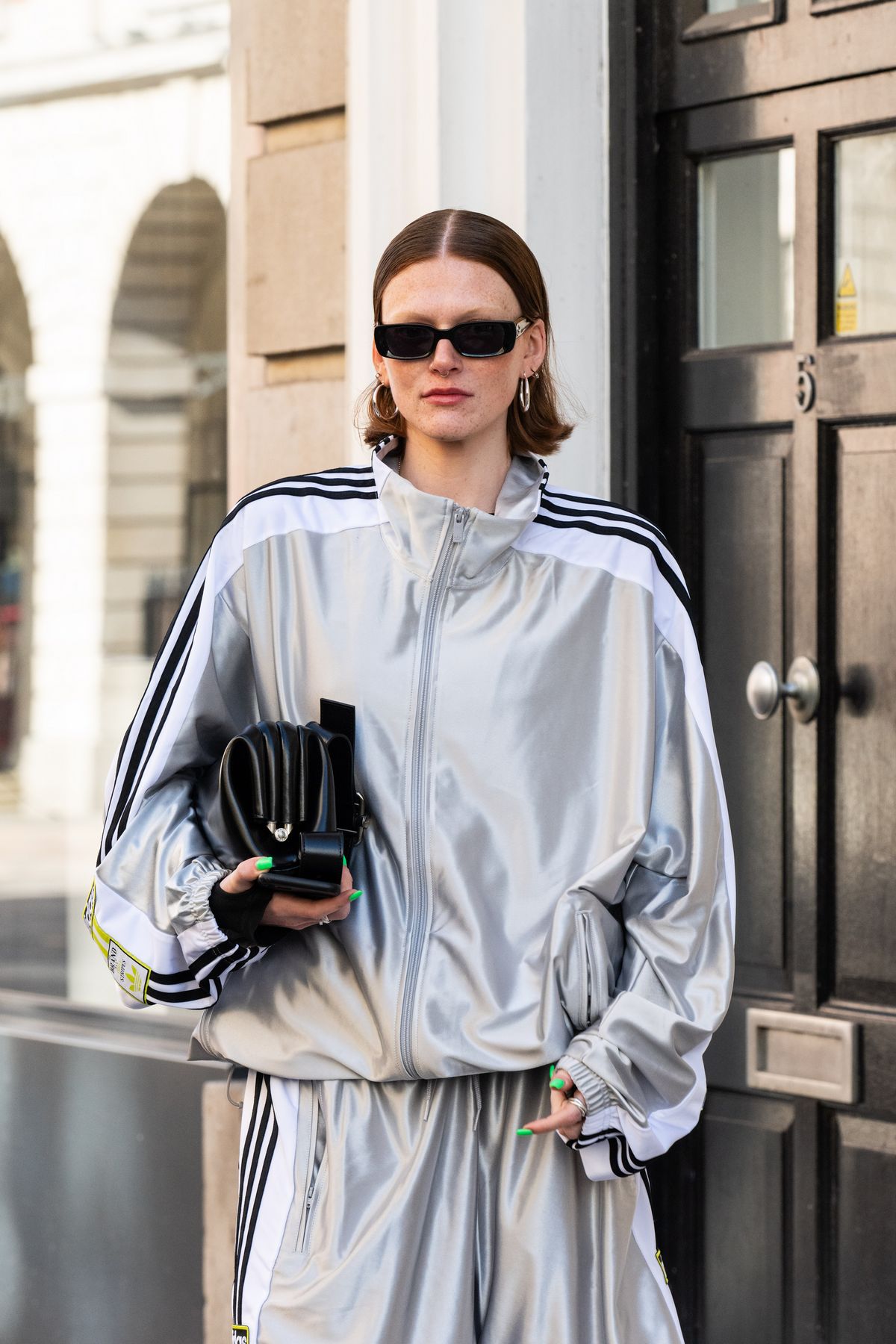 운동 후 벗어 놓은 재킷을 대충 걸친 룩과 ‘애써 무심함을 연출한’ 룩은 그야말로 한 끗 차이죠. 공들여 스타일링한 머리와 주얼리, 액세서리는 트랙 재킷 데일리룩을 시크하게 만들어주는 조력자입니다. 특히 볼드한 귀걸이와 선글라스는 필수!