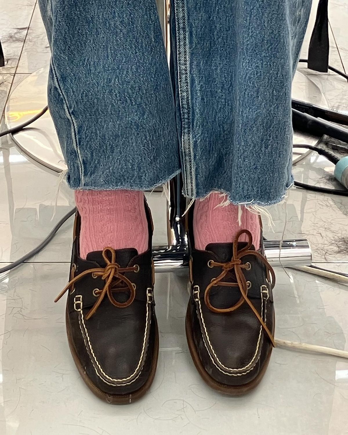 사실 이 신발과 가장 잘 어울리는 하의는 무릎 길이의 반바지입니다. 가장 자연스러우면서 보트 슈즈 특유의 멋스러움이 잘 드러나는 ‘원중킹’다운 룩이지요? 러프하게 밑단을 자른 청바지에 핑크색 양말 그리고 보트 슈즈를 매치한 날의 룩도 눈여겨보세요.