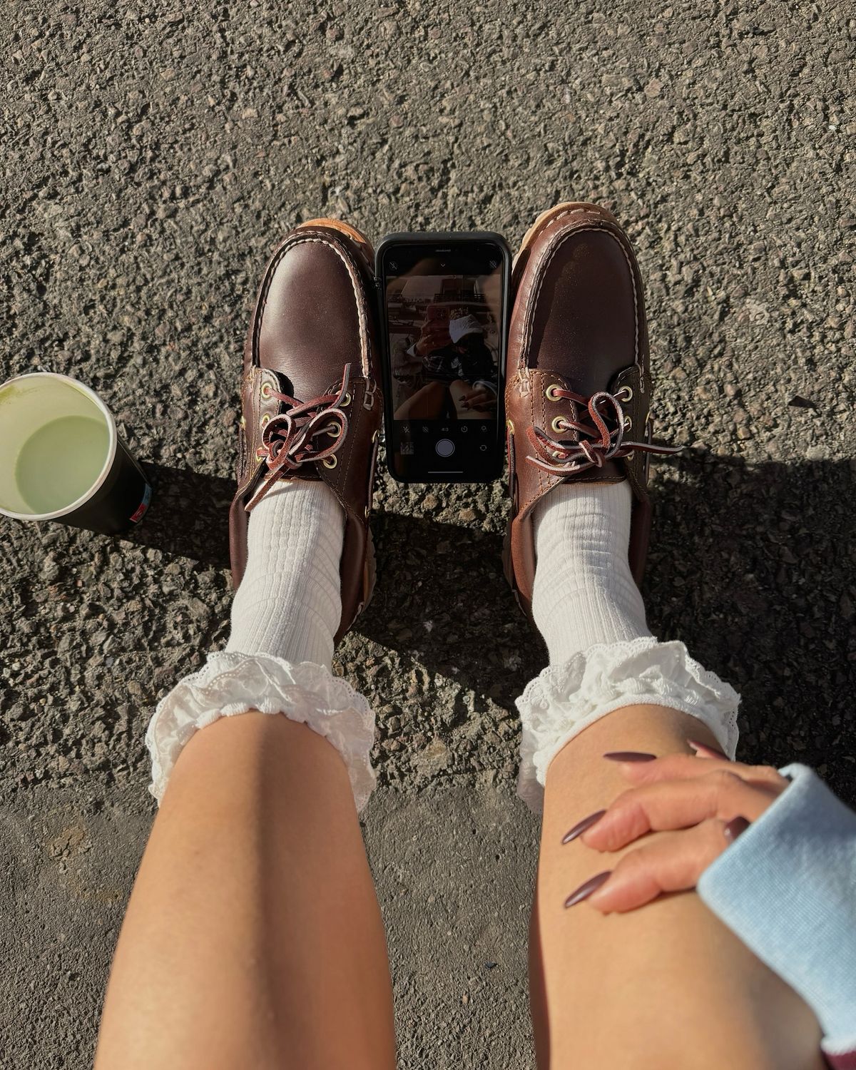 ‘러블리’ 스타일링도 물론 가능합니다. 디지털 크리에이터 뮬바다는 프릴 장식이 달린 양말과 함께 팀버랜드의 보트 슈즈를 신었습니다. 짧은 스커트와 스트라이프 티셔츠로 완성한 프레피 스타일에 이 신발이 제대로 포인트가 되어주네요.