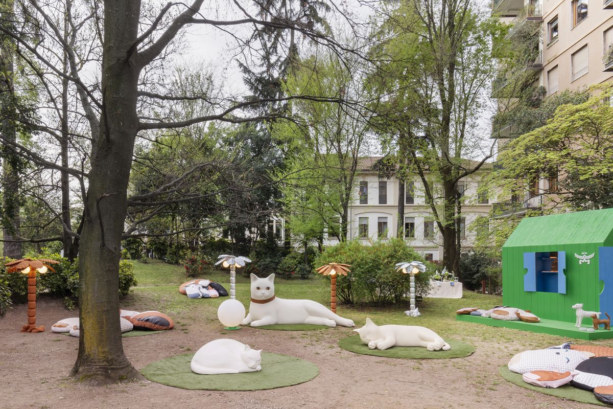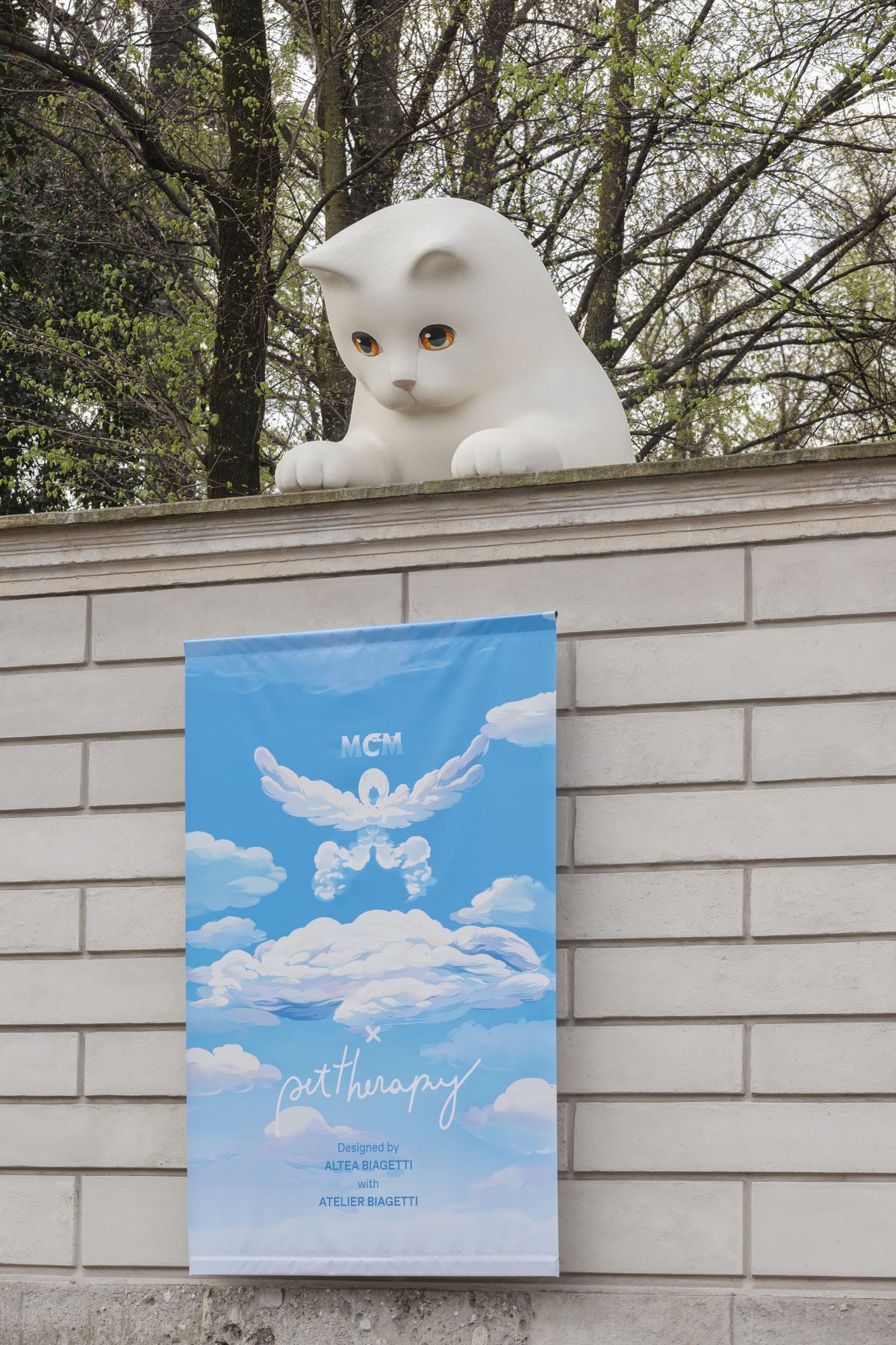 펫 테라피 컬렉션이 공개되는 자르디노 델레 아르티(GIARDINO DELLE ARTI)로 향하는 길, 도심의 북적임을 지나 한적한 길에 들어서자 커다란 고양이 조형물이 고개를 빼꼼 내밀며 맞이한다. 그 순간, 이곳이 MCM의 전시임을 단박에 알 수 있었다. 이탈리아의 봄 햇살 아래 정원 곳곳에 놓인 목재 미니어처 하우스, 야자수 조명 아래 고양이와 강아지 모양의 푸프에 앉은 사람들과 반려동물의 모습이 평화로워 보였다. 그 풍경은 단순하지만 직관적인 아름다움, 본능적으로 느껴지는 순수함과 따뜻함이 느껴졌다. 그 감각적 경험의 비밀은 현장에서 만난 디자이너 알베르토 비아게티(Alberto Biagetti)와 라우라 발다사리(Laura Baldassari)를 통해 들을 수 있었다.