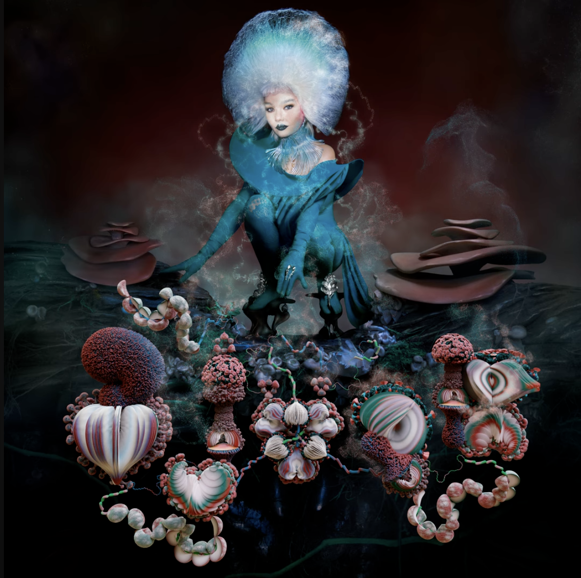 사진가 닉 나이트의 사진집 커버로 알려진 데본 아오키의 몽환적인 비주얼은 비요크의 <Homogenic> 앨범을 오마쥬 한 것으로 유명합니다. 푸른 매화꽃이 가득한 맥퀸의 동양적 가운과 숀 린이 제작한 티베트 전통 악세서리에서 영감받은 넥 피스는 당시 굉장한 화제를 불러일으켰습니다. 그리고 비요크의 바이닐 커버와 관련해 여러분이 기억할 만한 점 하나 더! 2022년에 발매한 <Fossora> 앨범 커버 속 룩은 한국 디자이너 지수백의 의상이라고 하네요.