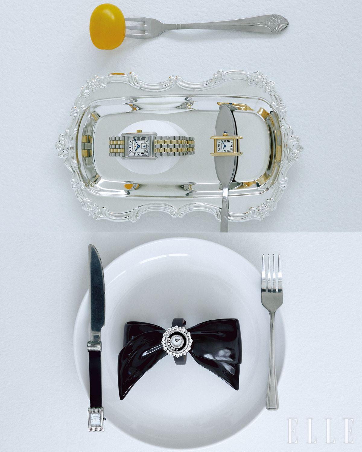 (위) 스테인리스스틸과 옐로골드를 조합한 브레이슬릿의 론진 미니 돌체비타 워치는 7백50만원, Longines. 스트랩 탈착이 가능하며 비즈 크라운에 사파이어를 세팅한 탱크 루이 까르띠에 워치는 1천만원대, Cartier. (아래) 나이프 위에 올린 버티컬 스틸 케이스의 스몰 리플레 워치는 5백만원대, Boucheron. 리본 핀으로 연출한 다이얼에 일곱 개의 무빙 다이아몬드가 경쾌하게 움직이는 해피 다이아몬드 워치는 9천9백89만원, Chopard. 리본 핀은 가격 미정, Balenciaga.
