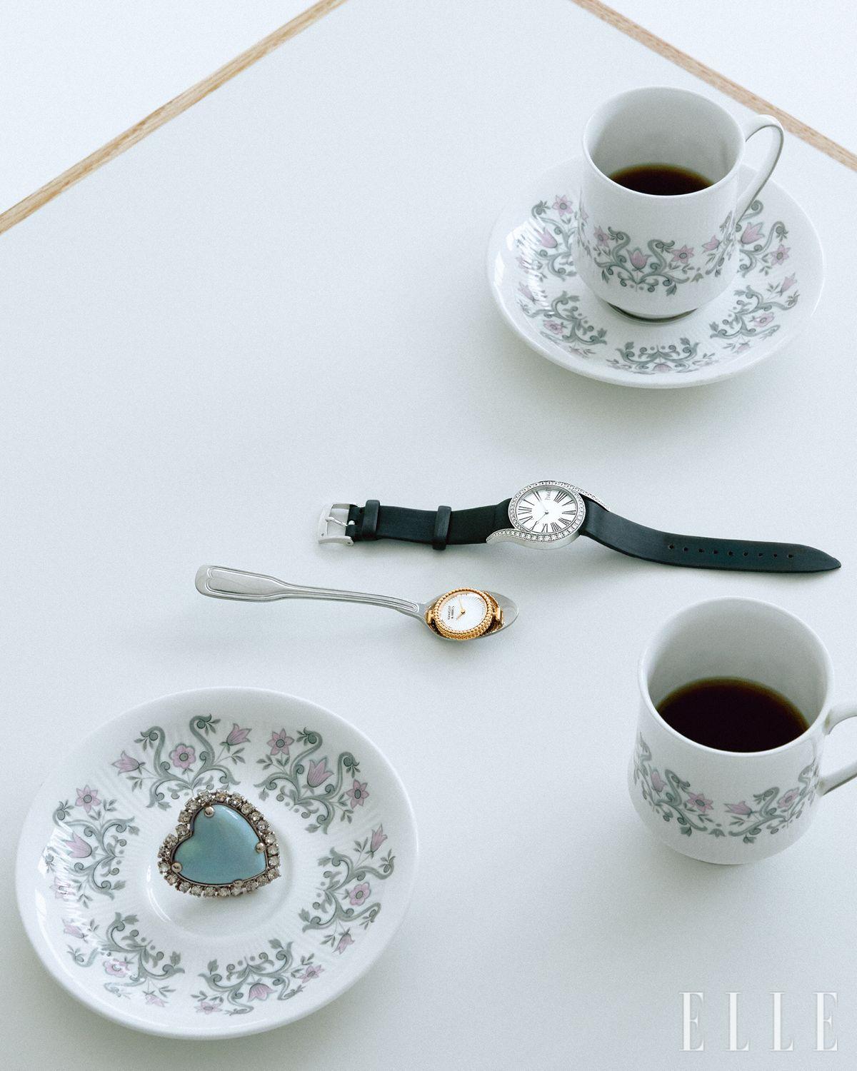 라운드 컷 다이아몬드를 일렬로 세팅해 베젤의 곡선을 강조한 블랙 새틴 스트랩의 라임라이트 갈라 워치는 가격 미정, Piaget. 스트랩 탈착이 가능하며 섬세하게 세공한 비즈로 로즈골드 케이스와 브레이슬릿을 장식한 뻬를리 워치는 1천2백90만원, Van Cleef & Arpels. 소서 위의 하트 이어링은 가격 미정, ValentinoGaravani.