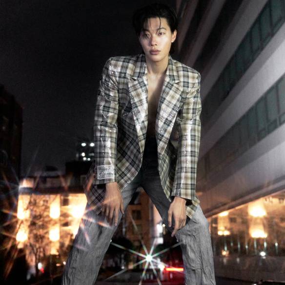 베이지 체크 스팽글 재킷은 Egonlab by 10 Corso Como Seoul. 데님 팬츠는 Bottega Veneta. 블랙 부츠는 Alexander McQueen.