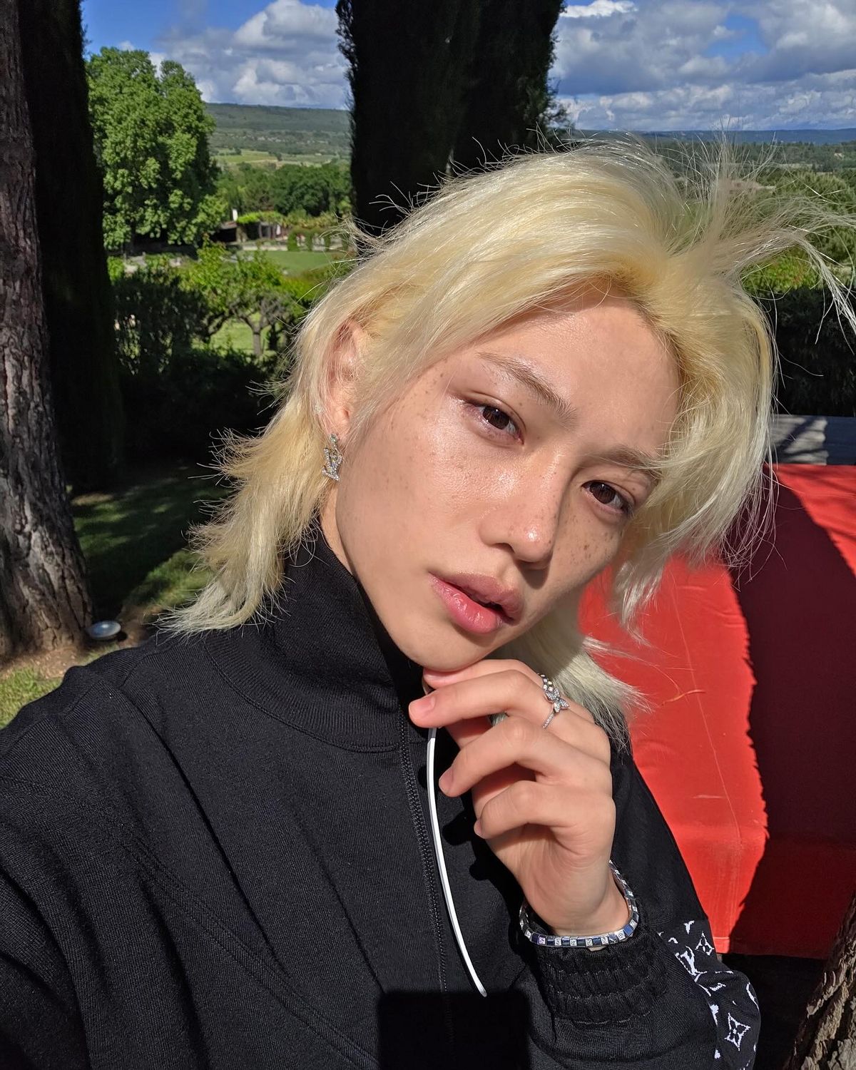 쇼 시작 전 필릭스는 파스텔톤이 아닌 올블랙 룩으로 제대로 된 오프 모먼트를 보여줬습니다. 포근한 검정 집업 아우터를 걸친 그의 룩이 쇼에서의 화려함과 대조를 이루며 분위기를 반전시켰죠. 헤어와 메이크업을 하기 전 민낯의 필릭스에게선 주근깨와 자연스러운 미소가 빛납니다. 햇살 아래 한층 부드럽고 인간적인 필릭스의 매력이 그대로 담긴 순간이네요.
