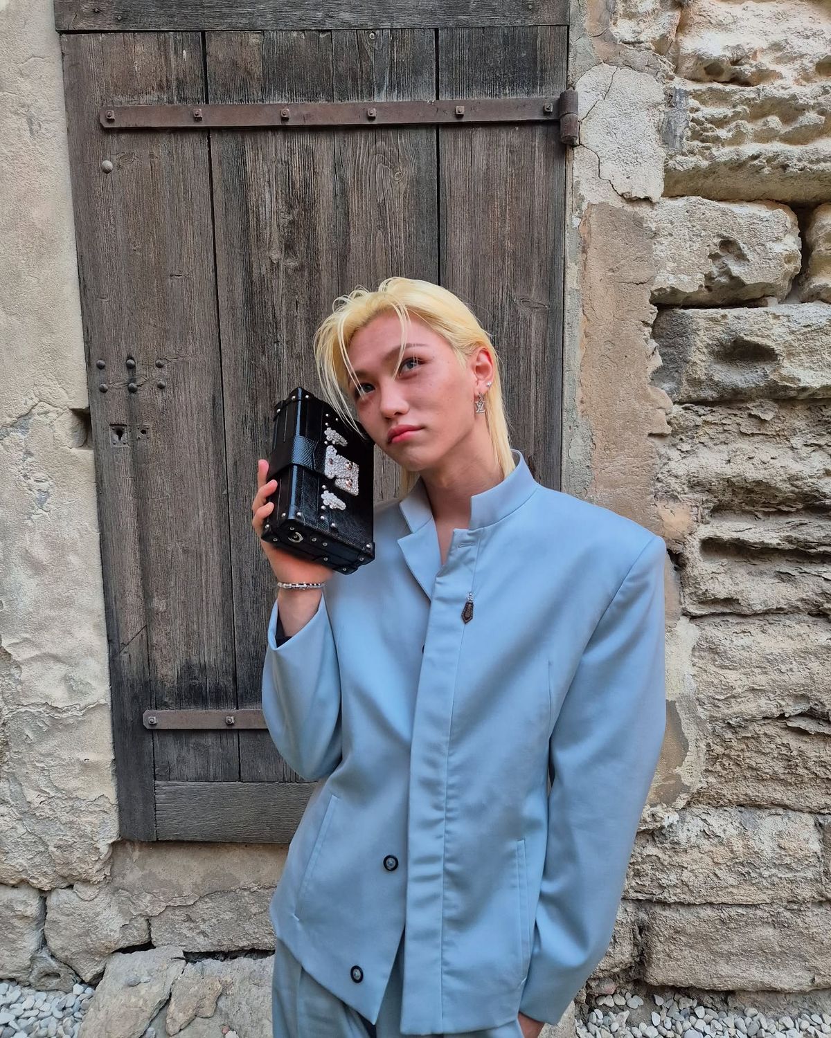 포인트 아이템도 빼놓을 수 없죠. 필릭스는 루이 비통 쁘띠뜨 말 스페셜 에디션을 들고 등장했어요. 클래식한 모노그램 검정 패턴 위에 큐빅 장식이 더해져 필릭스의 룩을 더 고급스럽게 완성시켰습니다. 이어진 오프샷에서는 핸드백을 귀에 대고 전화받는 듯한 장난기 가득한 포즈를 보이며 팬들을 웃음 짓게 만들었네요.
