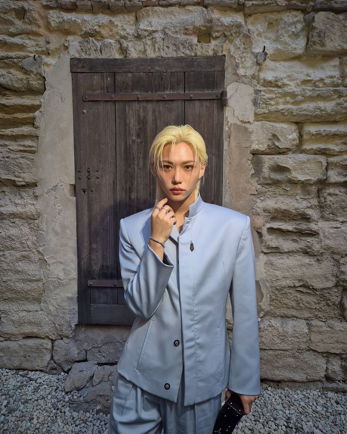 필릭스가 이번 쇼를 위해 선택한 컬러는 바로 하늘색. 그와 어울리는 파스텔톤 하늘색으로 자켓과 팬츠의 컬러를 통일했습니다. 이러한 룩은 그의 시그니처인 금발 헤어와 대비를 이루며 몽환적인 분위기를 더했어요. 자연스럽게 올린 칼라와 몇 개 풀린 단추는 단정함과 자유로움의 경계를 넘나들며, 마치 동화 속 왕자 같은 분위기를 완성했고요.