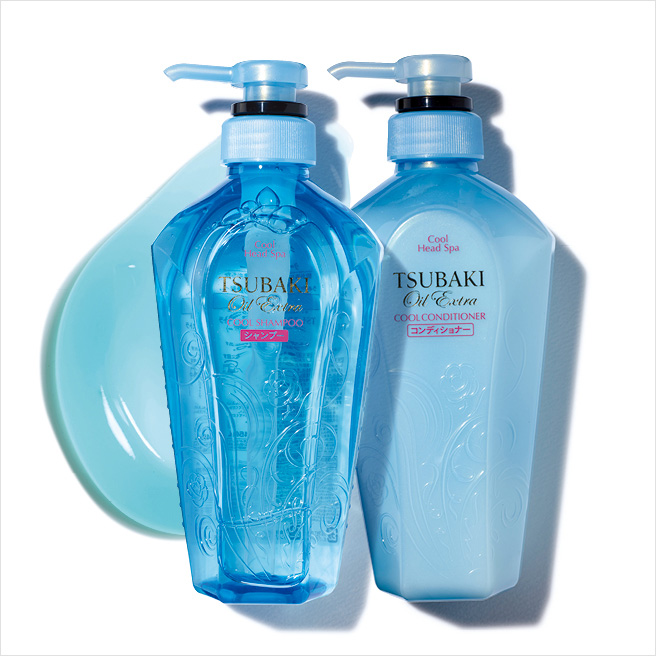 쿨 민트 성분이 열받은 두피 온도를 식히고 모발 끝은 더욱 실키하게 가꿔주는 오일 엑스트라 쿨 샴푸 & 컨디셔너, 2만4천원(세트 판매), Tsubaki.