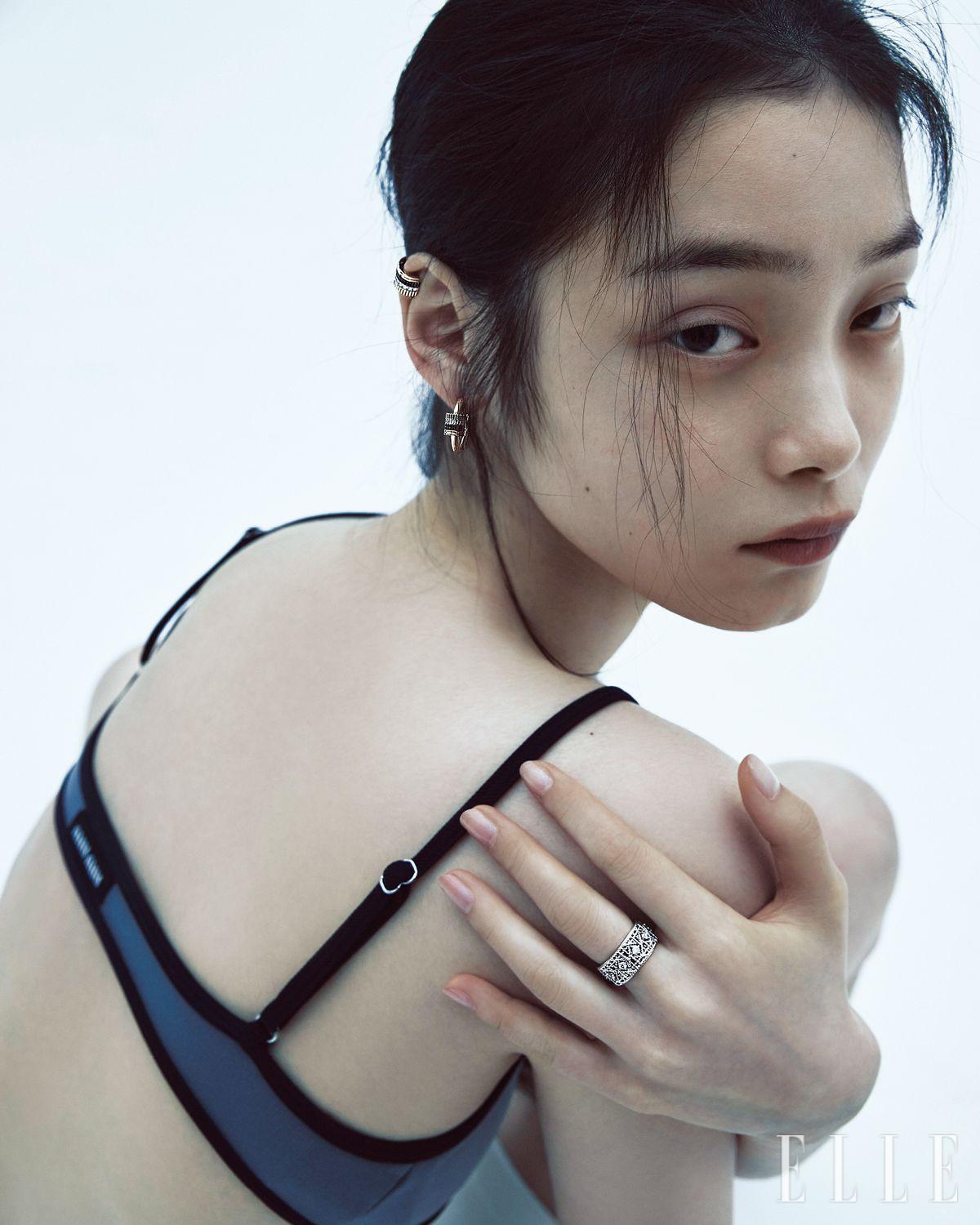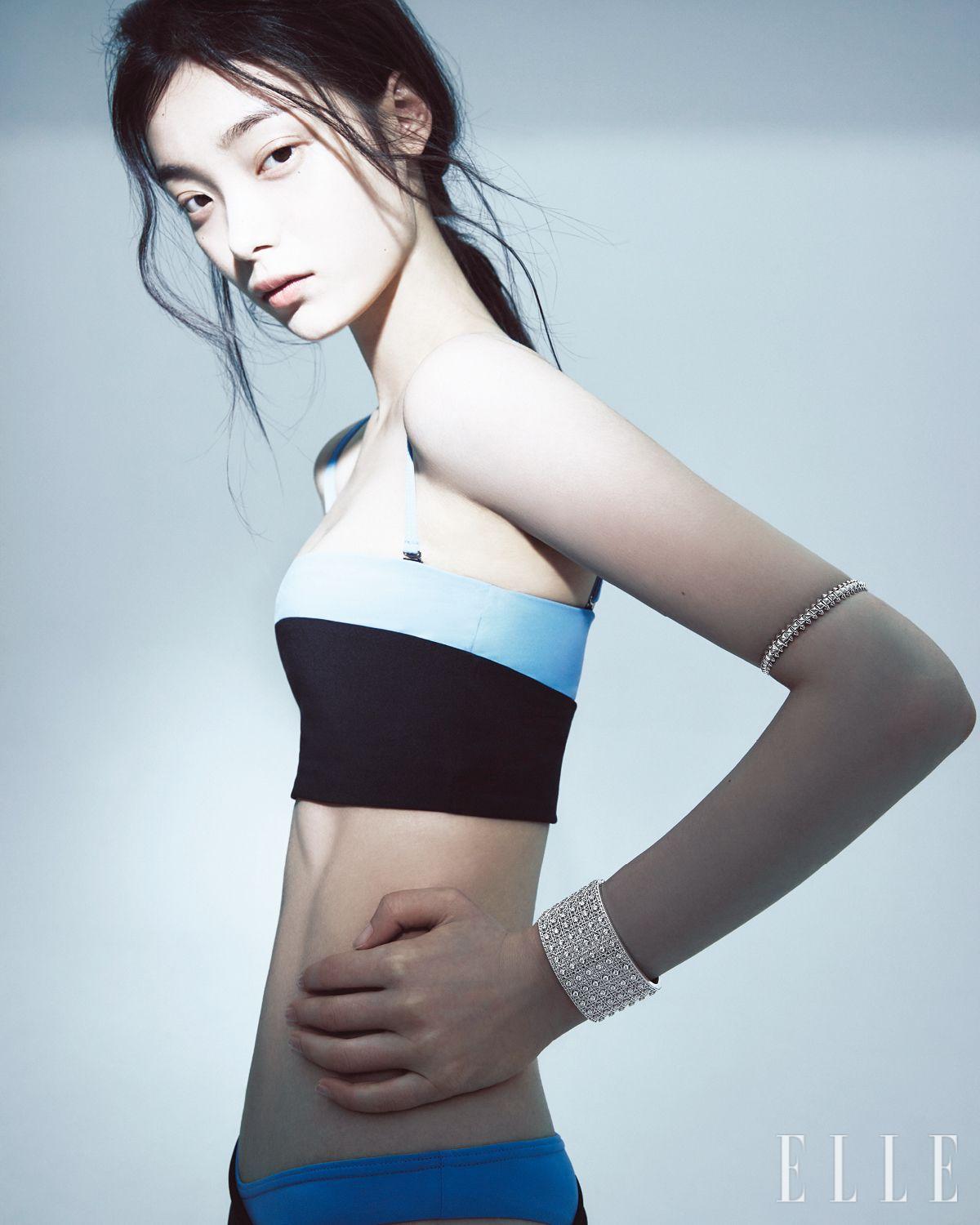 팔에 착용한 로듐 도금의 화이트골드 클래쉬 드 까르띠에 브레이슬릿은 1천6백만원대, Cartier. 손목에 착용한 화이트골드에 다이아몬드를 세팅한 마이 디올 커프는 가격 미정, Dior Joaillerie. 톱 두 개를 레이어드해 컬러 믹스를 연출한 비키니 톱과 브리프는 9만8천원, 모두 Amun. 블랙 레깅스는 5만9천원, Arena.