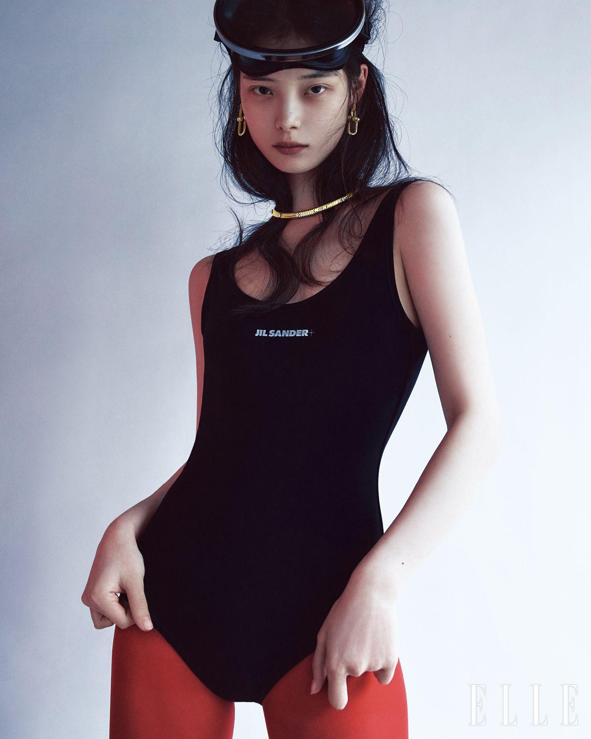옐로골드 티파니 하드웨어 링크 이어링은 가격 미정, Tiffany. 옐로골드에 다이아몬드를 파베 세팅한 불가리 투보가스 네크리스는 3천90만원, Bvlgari. 브랜드 로고가 포인트인 스윔수트는 가격 미정, Jil Sander.수경과 스타킹은 모두 에디터 소장품.