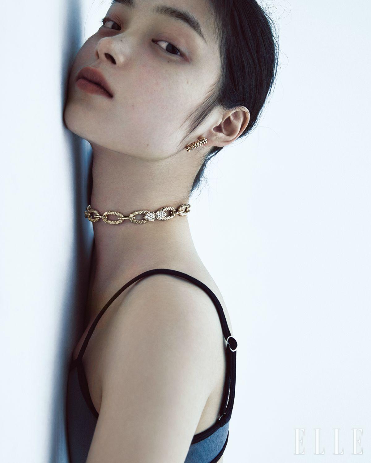 오트 쿠튀르 직물의 주름을 모티프로 한 옐로골드 콰트로 그로그랭 싱글 클립 이어링은 1백만원대, Boucheron.베이지· 화이트골드와 다이아몬드로 이뤄진 코코 크러쉬 싱글 이어링은 가격 미정, Chanel Fine Jewelry. 옐로골드의 티파니 하드웨어 그레듀에이티드 링크 네크리스는 가격 미정, Tiffany. 스퀘어 안경은 51만5천원, Gucci by Kering Eyewear. 홀터넥 스윔수트는 5만9천원대, Zara.