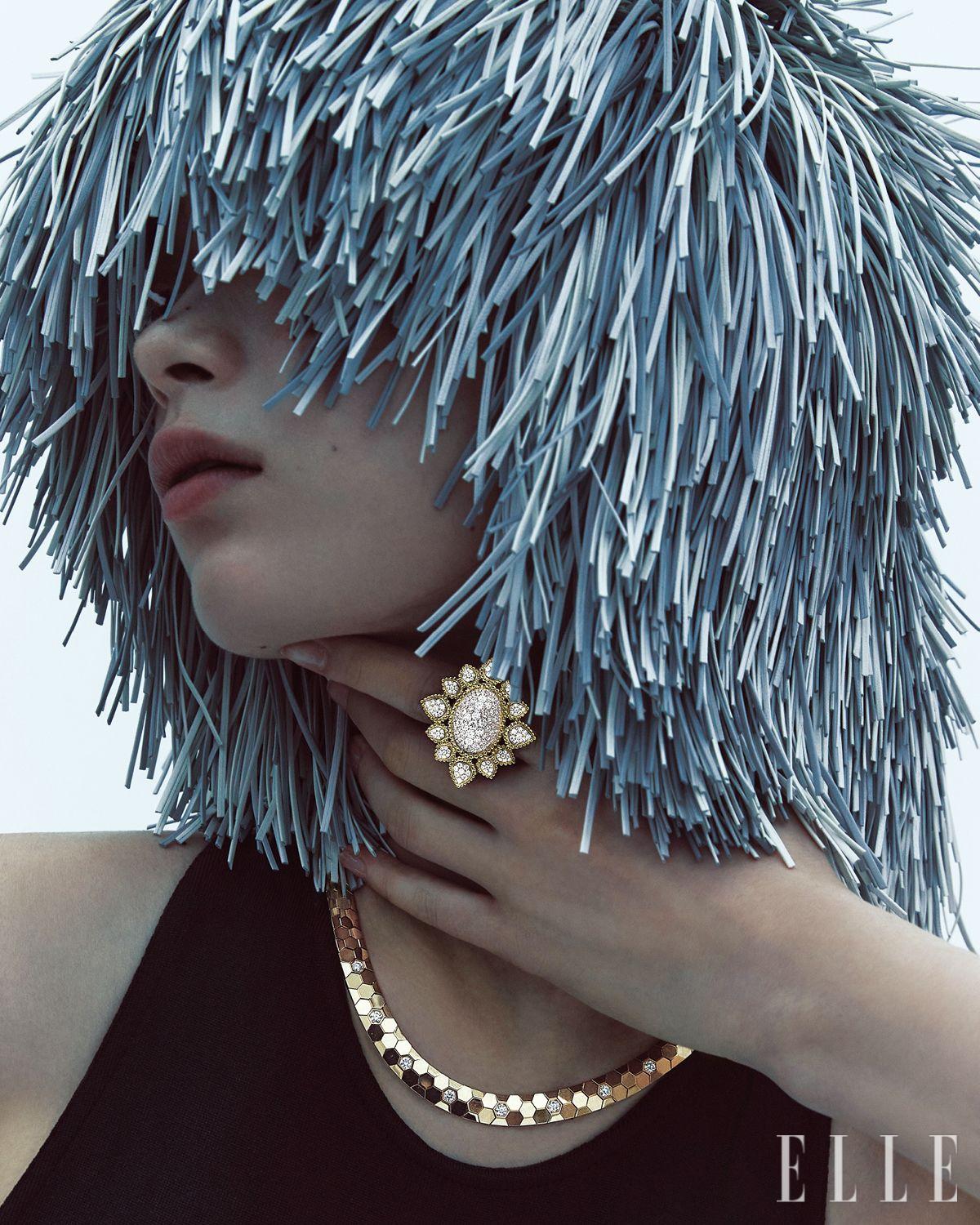 옐로골드에 다이아몬드를 파베 세팅한 쎄뻥 보헴 빈티지 옐로골드 링은 3천만원대, Boucheron. 로즈골드에 아홉 개의 브릴리언트 컷 다이아몬드를 세팅한 비 드 쇼메 네크리스는 9천3백만원대, Chaumet. 헤드피스는 가격 미정, Bottega Veneta. 스윔수트는 가격 미정, Philosophy.