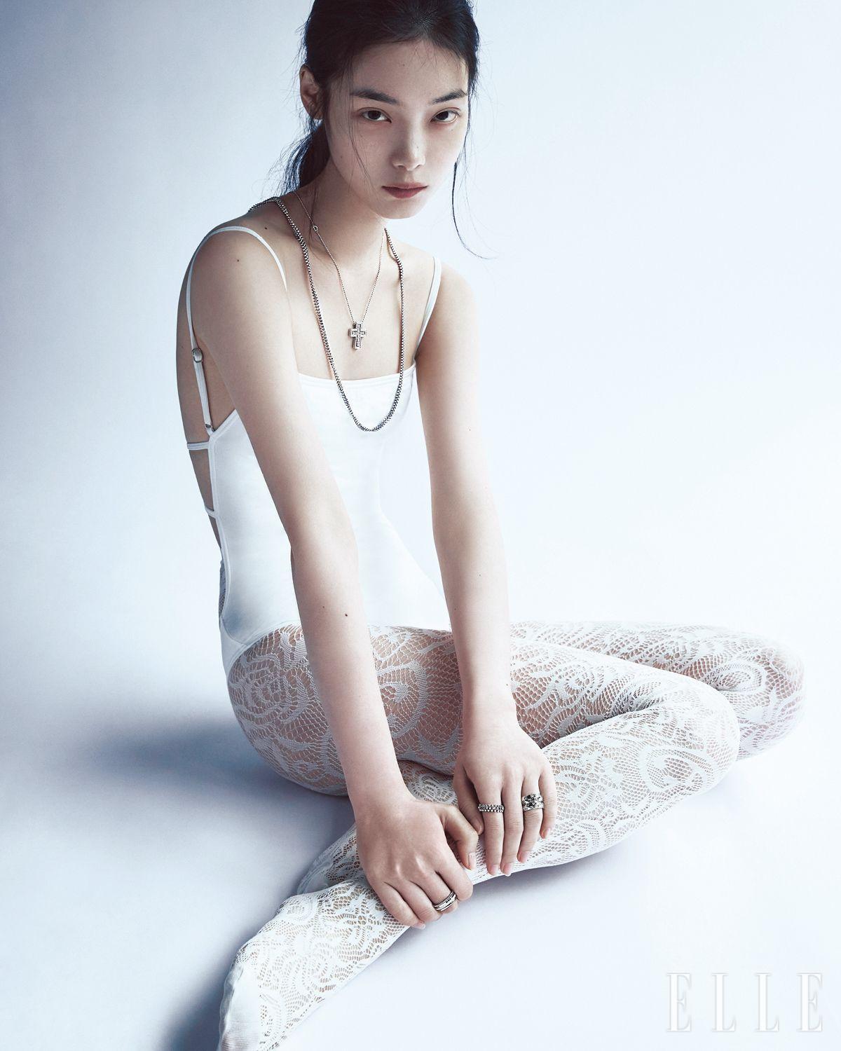 다양한 길이로 연출 가능한 화이트골드 클래쉬 드 까르띠에 네크리스는 가격 미정, Cartier. 화이트골드에 다이아몬드를 세팅한 벨에포크 네크리스는 가격 미정, Damiani. 오른손에 착용한 화이트골드와 화이트 세라믹의 콰트로 더블 화이트 스몰 링은 6백만원대, Boucheron. 왼손 검지에 착용한 화이트골드 클래쉬 드 까르띠에 링은 4백만원대, Cartier. 약지에 레이어드한 화이트골드에 다이아몬드를 세팅한 미디엄과 라지 사이즈의 르 다미에 드 루이 비통 링은 가격 미정, 모두 Louis Vuitton Fine Jewelry. 화이트 스윔수트는 9만8천원대, Amun. 스타킹은 에디터 소장품.