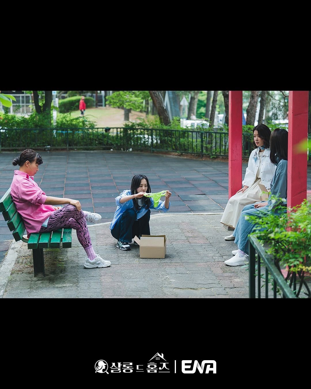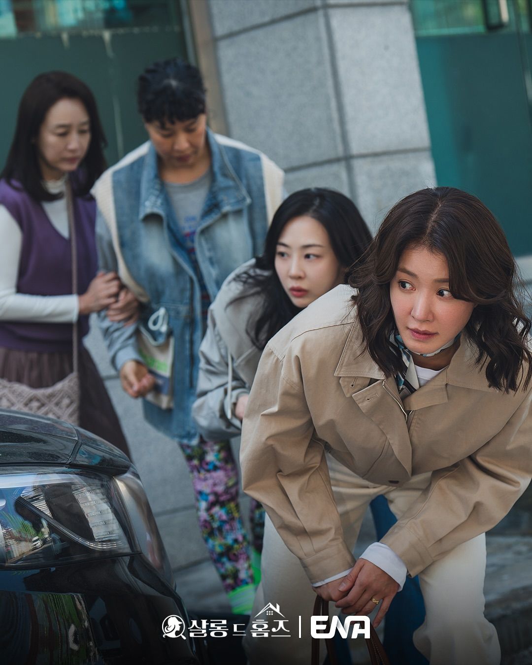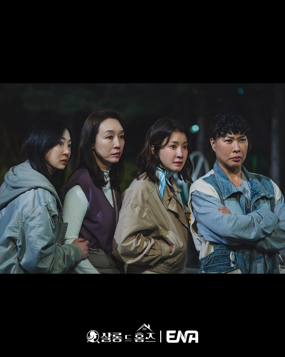 한편, ENA 드라마 <살롱 드 홈즈>는 훨씬 더 경쾌하고 생활 밀착적인 워맨스를 보여줍니다. 서울 외곽의 낡은 아파트 ‘광선주공’ 단지를 배경으로 벌어지는 이 드라마는 이시영, 정영주, 김다솜, 남기애가 단지 내 해결사 여성 4인방으로 등장해 벌이는 추리 활극이죠. 여성 공동체가 동네에서 벌어지는 사건들을 해결하는 본격 여성 공동체극이죠. 첫 출발은 1%대였으나 큰 홍보 없이도 점점 입소문을 타고 6회차가 공개된 7월 1일 최고 시청률 3.4%를 기록하며 호평을 얻고 있습니다.