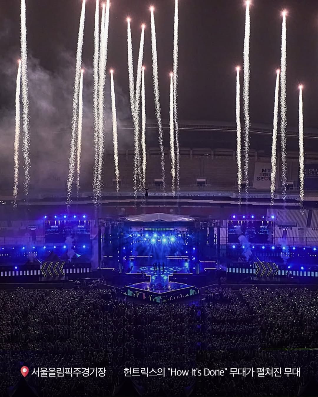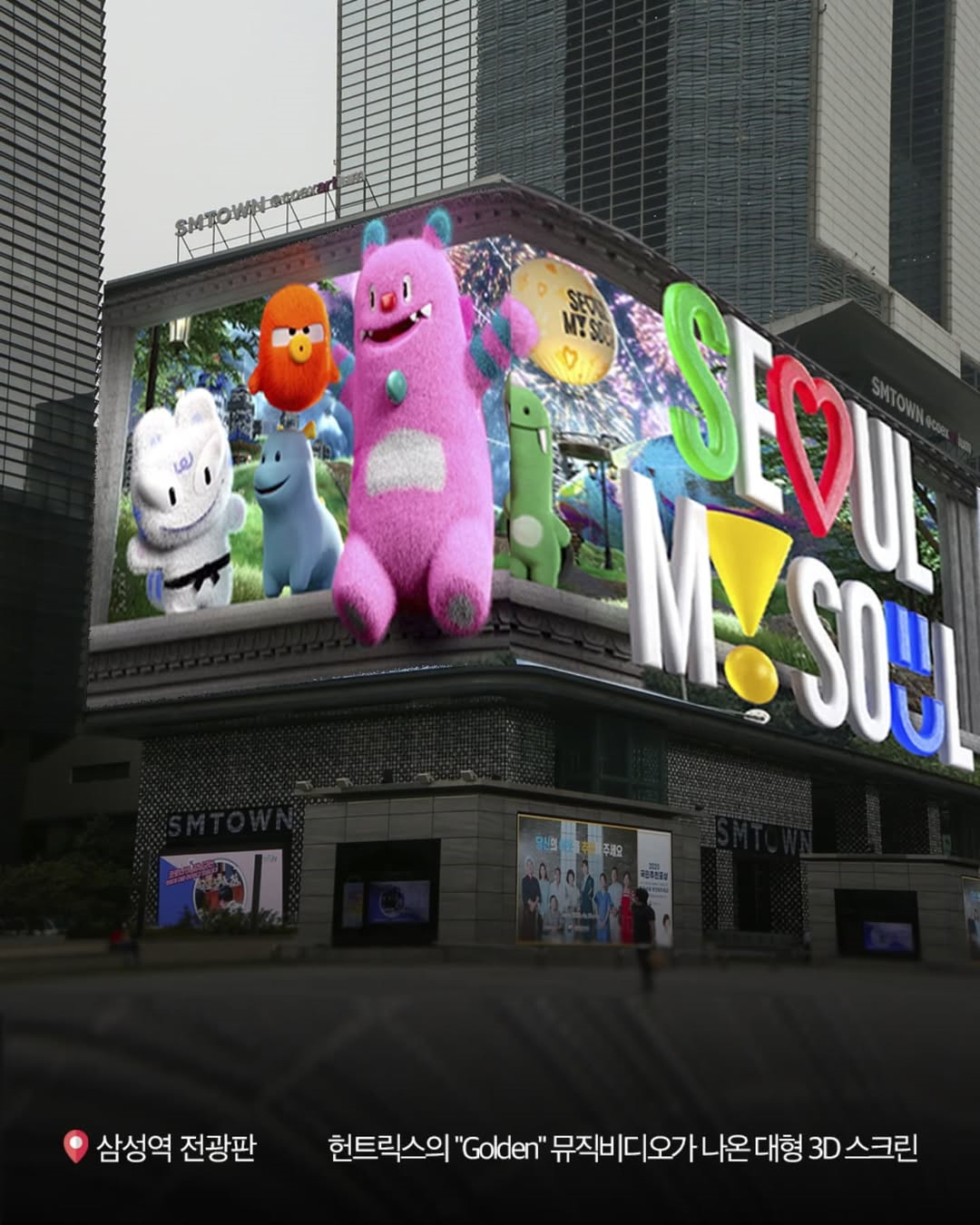 현재는 리뉴얼 공사 중인 서울올림픽주경기장은 헌트릭스의 무대가 펼쳐진 장소입니다. 여기서 헌트릭스는 'How It's Done'을 열창해 팬들의 마음을 훔쳤어요. 삼성역의 대형 3D 전광판에선 헌트릭스의 'Golden' 뮤직비디오가 나왔죠. 사자보이즈가 상큼한 복장으로 'Soda Pop'을 선보였던 곳은 명동 한복판이었습니다.