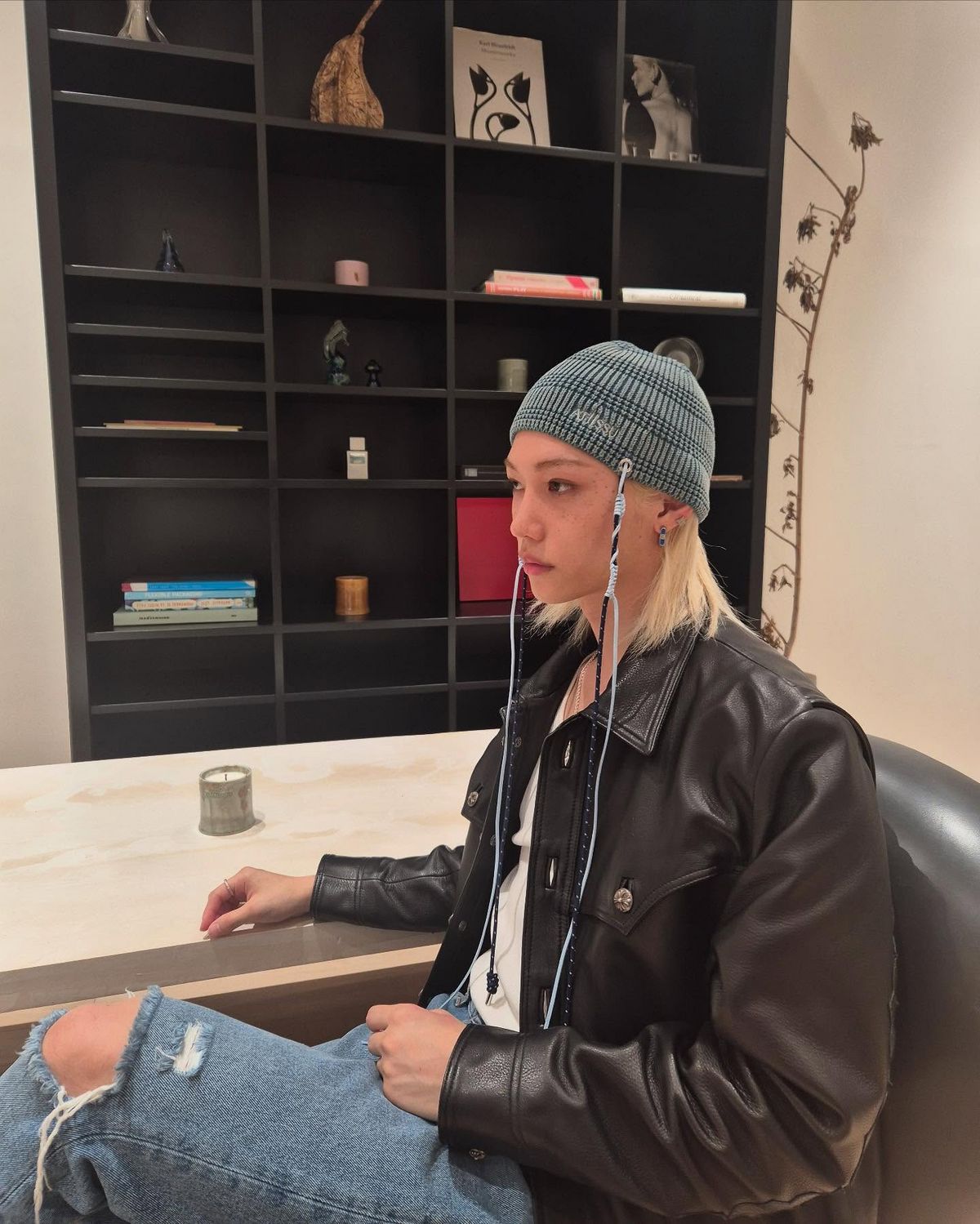 필릭스 룩에서 자주 발견되는 또 하나의 특징은 바로 ‘늘어짐의 미학’이에요. 루이비통 벨트를 허벅지까지 길게 늘어뜨리고, 바지에 체인을 무심히 더하는 식이죠. 모자 또한 선택이 남다릅니다. 어티슈의 비니 중에서도 줄이 길게 늘어진 디자인을 골라 정적인 룩에도 자연스럽게 움직임을 불어넣었으니까요.
