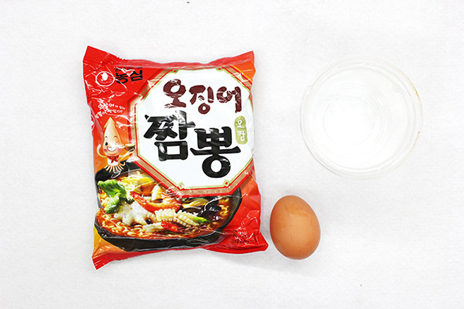 취향저격 라면(오징어짬뽕) 1개, 달걀 1개, 물 머그잔 1컵