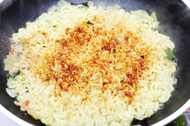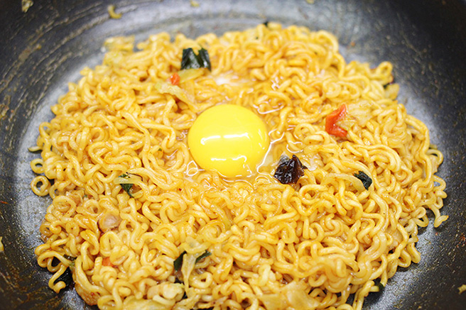 8 국물이 졸았고 면발도 익었으면 가운데 달걀을 풀어 뚜껑을 덮는다.