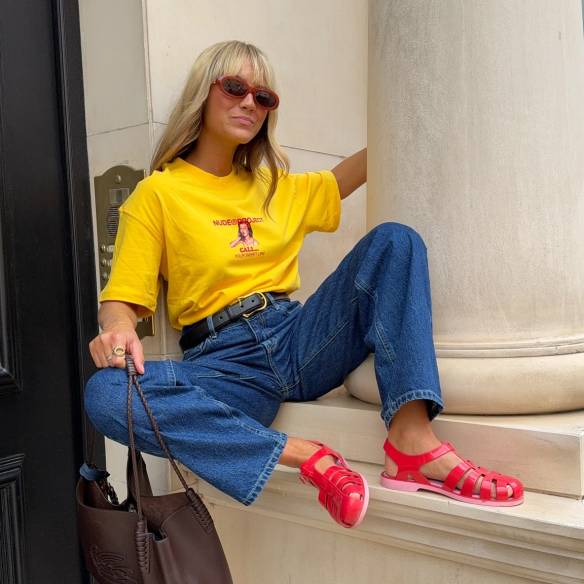 발목 길이의 장화는 롱 부츠보다 경쾌한 분위기를 띠고 활동하기에도 편합니다. 진흙탕이나 물웅덩이를 피할 수 있으면서 장시간 서 있고 걷는 상황에도 무리가 적고요. 특히 습하고 더운 여름엔 짧은 앵클 부츠가 통기성이 좋아 롱 부츠보다 쾌적하다는 장점도 있습니다. 화이트 조거 팬츠의 밑단을 부츠 안에 넣어 깔끔하게 마무리한 시에나 밀러의 팁도 기억해보세요.