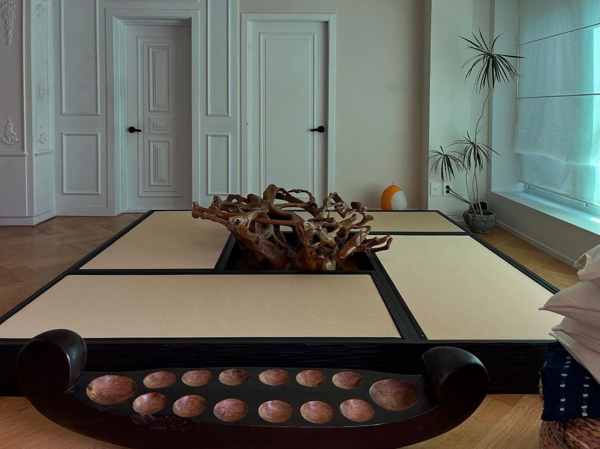 첫 번째로 소개한 공간은 그가 가장 애착을 가지고 있다는 거실입니다. 그중에서도 거실 중앙을 차지하고 있는 테이블이 눈길을 사로잡습니다. 원목 뿌리의 형상이 그대로 드러나는 이 테이블은 그가 중고장터에서 단돈 5만원에 구입한 빈티지 테이블입니다. 테이블 크기에 맞춰 주변을 나무를 한 땀 한 땀 깎아 만든 다다미로 에워싸 마치 나무가 거실 중심에서 자라나는 듯한 형태를 연상시킵니다. 다다미는 목수 김우주가 이끄는 핀아디자인이 제작을 맡았습니다.