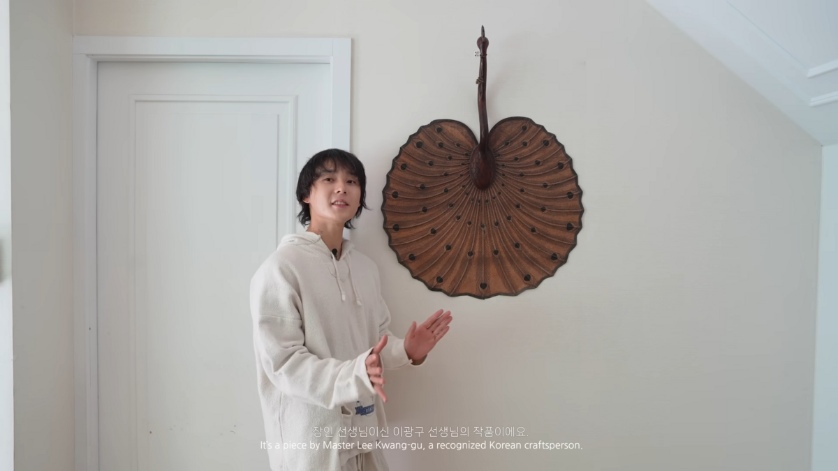 한쪽 벽에는 부채 형태의 오브제가 걸려 있습니다. 바로 충남무형문화재 21호이자 4대째 가업을 이어오고 있는 이광구 부채 장인의 ‘공작선’ 작품입니다. 이 역시 중고거래를 통해 구입한 것으로, 테이블부터 장인의 작품까지 가치 있는 물건을 알아보는 그의 안목이 돋보이죠.