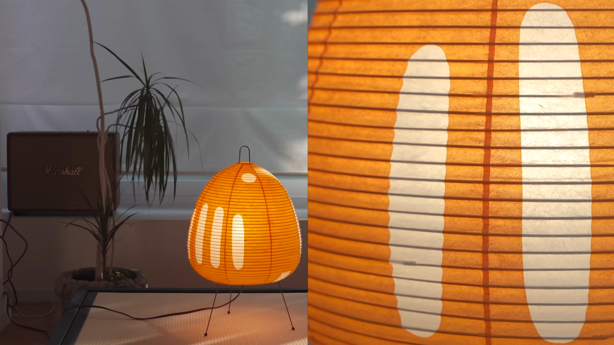 거실 한쪽에는 은은한 빛으로 공간을 감싸는 두 개의 조명이 놓여 있습니다. 하나는 이사무 노구치의 ‘아카리’ 시리즈 조명으로 우드와 화이트, 베이지 톤의 거실에서 오렌지 컬러의 빛을 발하며 생동감을 줍니다. 누에고치가 연상되는 스탠드 조명은 이던이 유튜브를 참고해 직접 제작한 조명입니다. 라탄으로 갓, 뼈대를 만들고, 한지를 덧붙인 뒤, 대나무 오죽으로 스탠드를 완성해 거실을 밝히고 있네요.