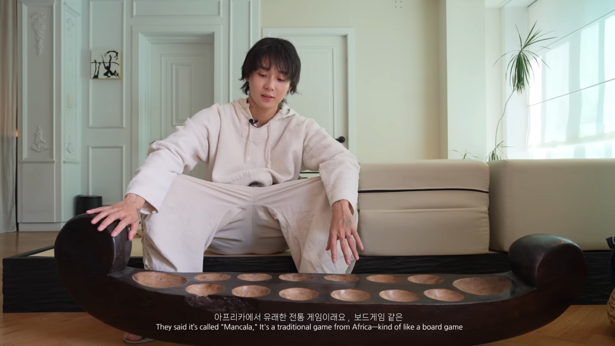 소파 옆에는 작은 홈이 파인 길쭉한 나무 판과 알갱이 모양의 오브제가 자리 잡고 있습니다. 아프리카 전통 보드게임 ‘만칼라’입니다. 동서양이 어우러진 공간 속에 존재감 있게 자리 잡아 이국적인 온기를 더합니다.