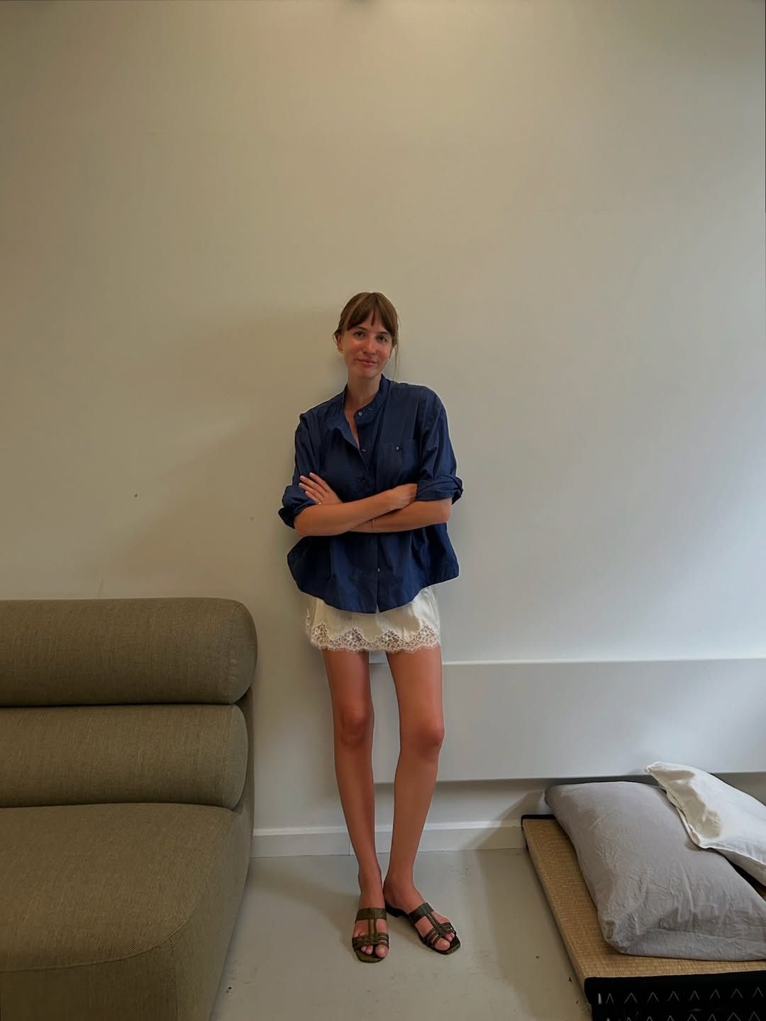 화이트 레이스 미니스커트 위에 자리한 네이비 셔츠는 의외로 신선합니다. 셔츠의 담백한 무드 덕분에 레이스가 과해 보이지 않죠. 헴라인에서만 은근히 드러나는 디테일이 오히려 더 세련돼 보이고요. 샌들을 매치해 힘을 뺀 것도 센스 있는 포인트입니다. 여름 끝자락에 도전하기 좋겠군요.