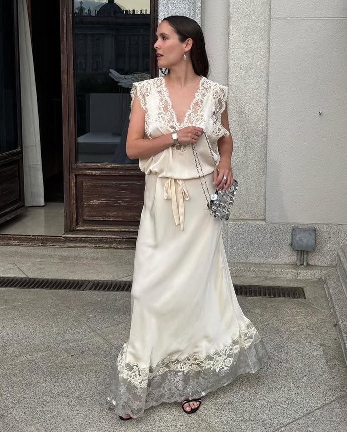 한 편의 영화 같은 룩이 필요한 날에도 레이스는 유용합니다. 레이스 장식이 촘촘히 더해진 아이보리 롱 드레스의 산뜻한 소재는 우아함을 한층 배가시키죠. 작은 클러치와 미니멀한 샌들로 과하지 않게 균형을 잡은 점도 눈에 띕니다. 목선과 어깨 라인이 드러나면서, 자연스럽게 여성스러움이 강조되죠.