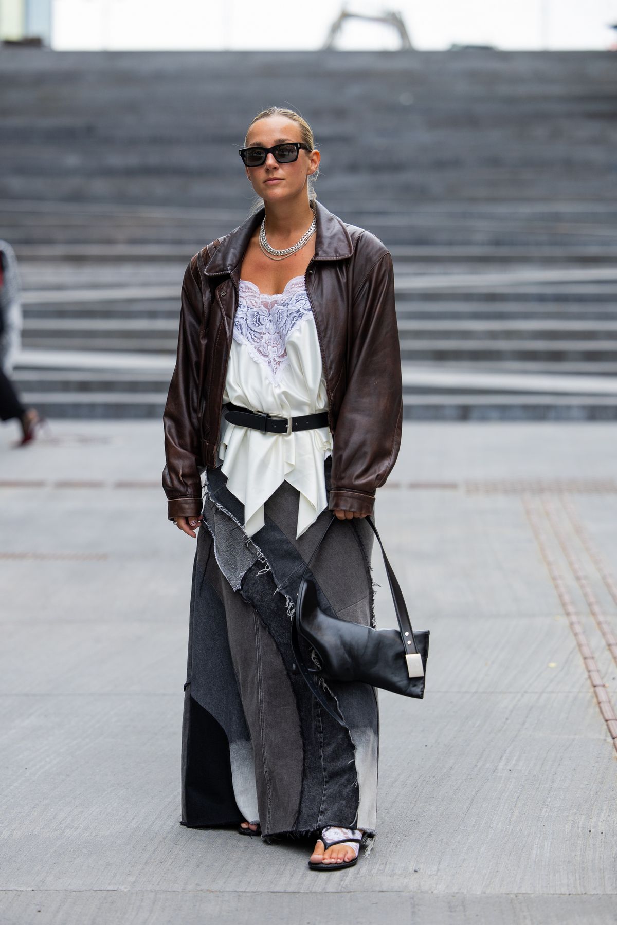 러프한 아이템 사이에 섬세한 레이스를 끼워 넣으니 이토록 쿨한 룩이 탄생했네요. 레이스 슬립 톱을 셔츠와 겹쳐 입고, 위에는 빈티지한 브라운 레더 재킷을 걸쳤어요. 디테일이 가득한 롱스커트로 하의에 무게감을 준 덕분에 상반신의 가벼운 레이스가 더 돋보입니다. 블랙 벨트로 허리를 강조해 실루엣에 변화를 주는가 하면, 발끝은 역시나 플립플롭으로 마무리했네요!
