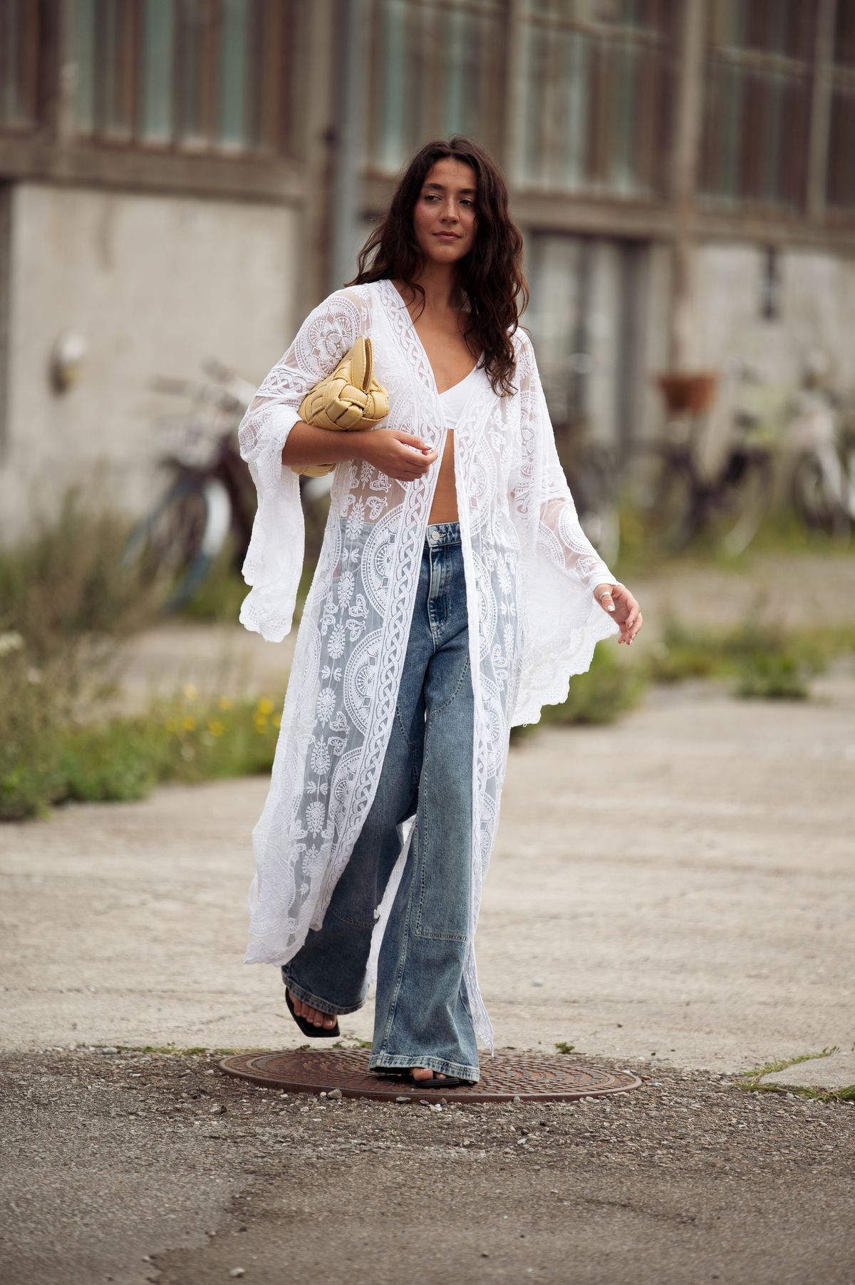 여름 휴가에서도 레이스를 느끼하지 않게 풀어내는 법은 다양합니다. 화이트 레이스 로브를 데님 팬츠 위에 툭 걸치니 무심하면서도 세련된 무드가 완성됐죠? 이너로는 브라톱을 선택해 휴양지에서만 만끽할 수 있는 대담하고 자유로운 분위기를 자아냈네요. 루스한 데님이 로브의 섬세함을 중화시켜준 덕분에, 바닷가에서 막 돌아온 듯하지만 도시에서도 여전히 통하는 다재다능한 룩이 완성됐군요.
