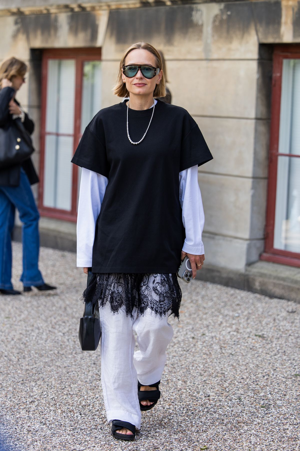 블랙 오버사이즈 티셔츠와 화이트 팬츠는 기본 중의 기본 조합입니다. 하지만 움직일 때마다 은근하게 드러나는 레이스 디테일이 완벽한 반전을 선사하죠. 덕분에 단순한 레이어링이 훨씬 더 입체적으로 보입니다. 큼직한 선글라스와 액세서리로 포인트를 주는 것도 잊지 않았고요.