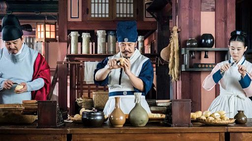 꽤나 시간이 흘러 궁중 요리는 훨씬 가볍고 코믹한 방식으로 소환됩니다. <철인왕후>는 현대의 건장한 청년이자 청와대 셰프인 장봉환의 영혼이 조선의 왕비 김소용의 몸에 빙의된 기상천외한 설정으로 시작하죠. 그녀가 등장하자 대령숙수가 이끄는 수라간은 엄숙한 공간에서 요리와 정치, 그리고 사랑이 뒤섞인 유쾌한 무대로 변신합니다. 현대의 주방 감각과 서양식 조리법이 궁중의 정갈한 수라상에 얹히면서 전통을 새롭게 해석하는 신선한 풍자가 탄생했죠. 왕비가 손수 요리를 하고 조선에 낯선 레시피를 선보이는 장면들은 요리를 단순한 소품이 아니라 서사의 핵심 장치로 끌어올렸습니다. 시청자에게는 “만약 조선 시대에 현대 셰프가 있었다면?”이라는 발칙한 질문을 던지며 궁중 요리 드라마의 영역을 코미디와 퓨전 사극으로 확장했습니다.